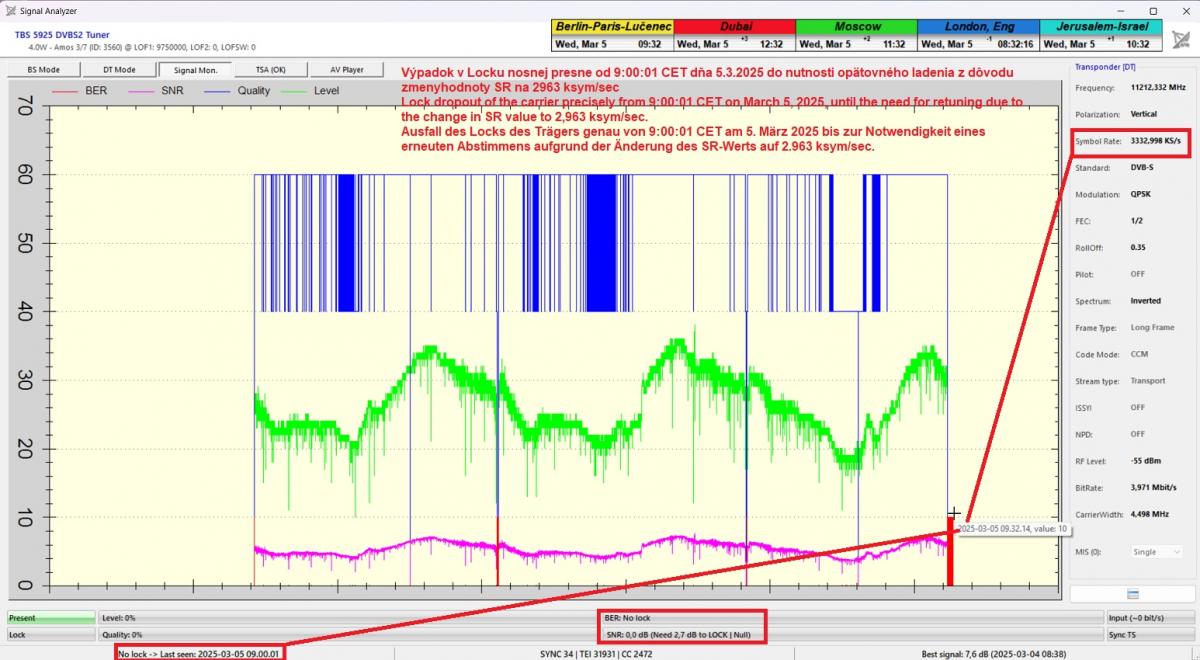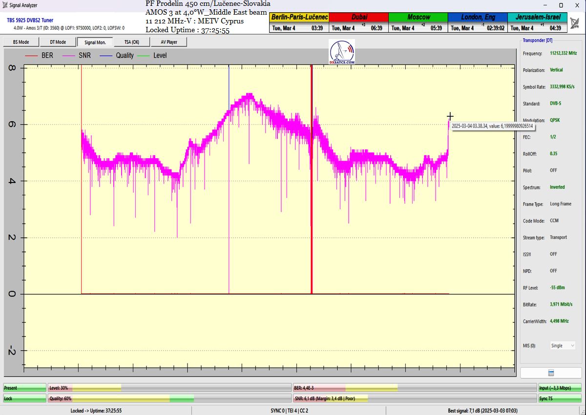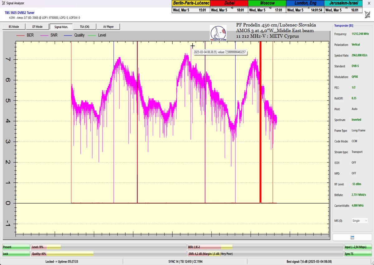 of satellite reception from the Middle East beam, after the parameter of Symbol Rate SR was changed to the current value of SR = 2,963 ksym/sec on March 5, 2025.