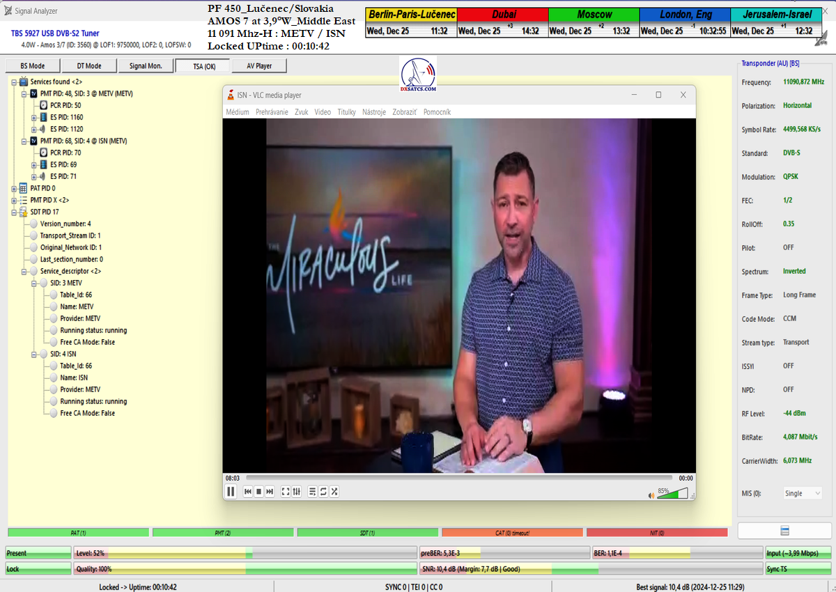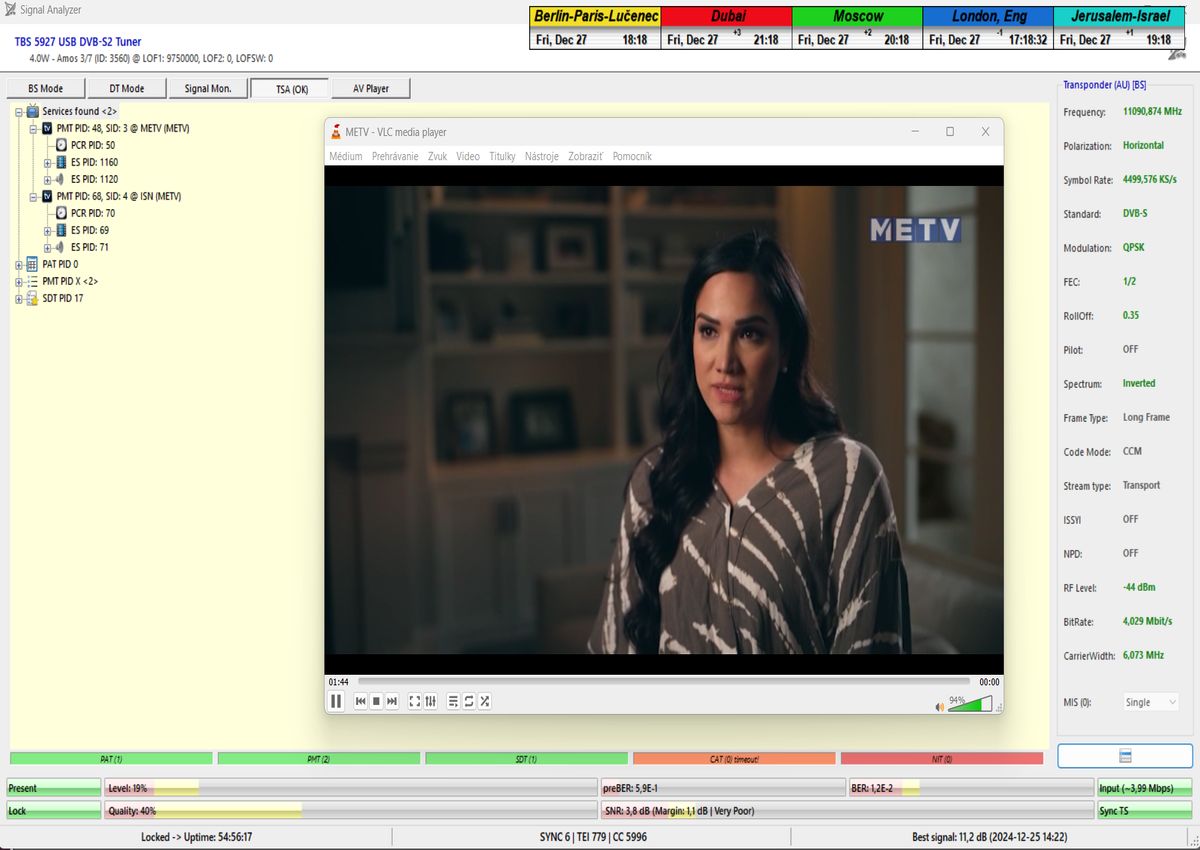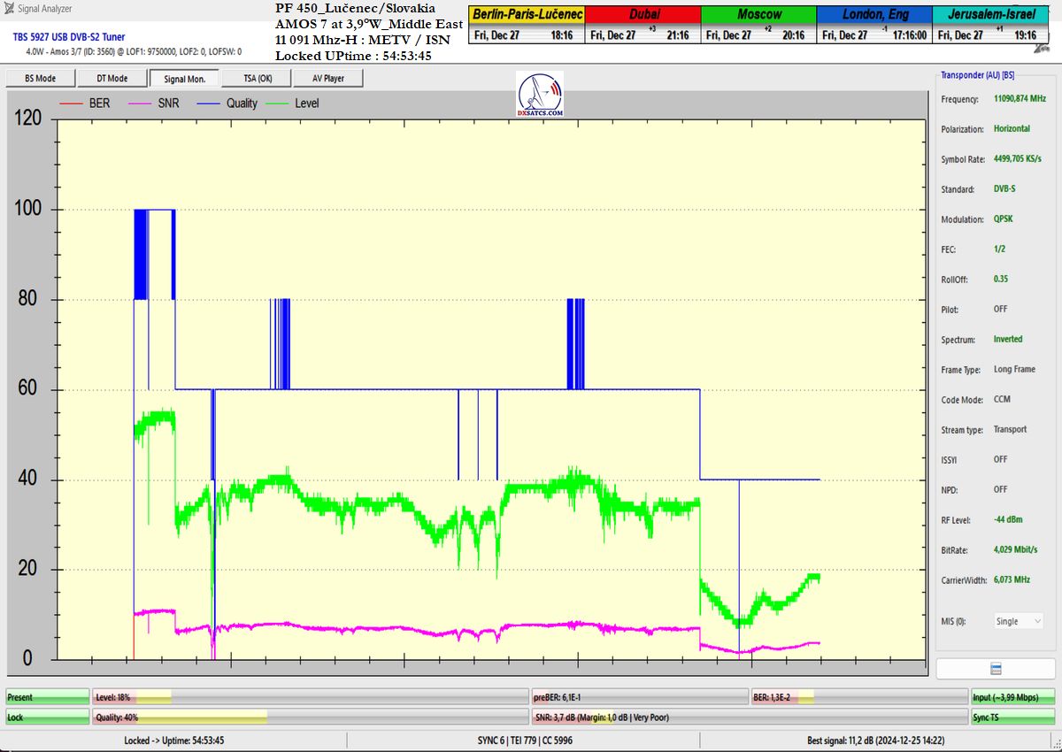 -špička kvality oscilovala od 10 do 11+ dB dňa 25.12.2024- -plná stabilita príjmu bez jedinej pixlácie aj pri minimálnej úrovni kvality od 1,9 do 2,5 dB-