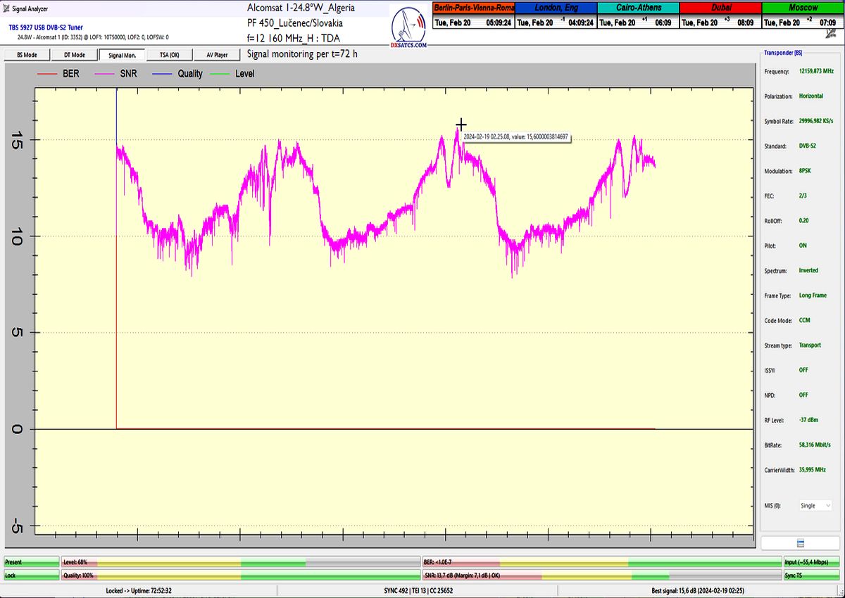 28.2.2024 : Author Roman Dávid is the first in Europe to achieve stable reception at 100% without a single dropout in the continuity of the Lock carrier with peak quality SNR=15.6 dB at the monitored frequency f=12 160 MHz in the geographical location of Central Europe and in the verification unit of t=72 hours with a reflector of a given diameter,provided by the Algerian provider TDA from the Alcomsat 1 satellite at 24.8°W.