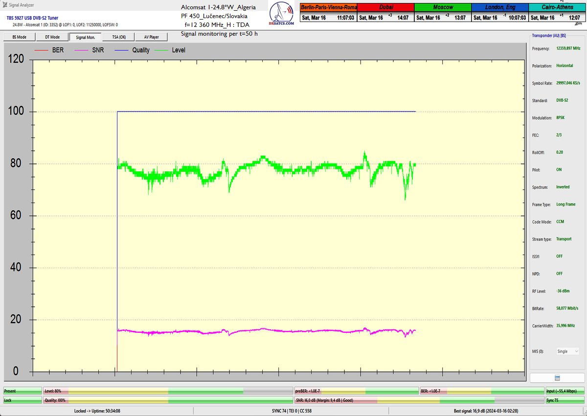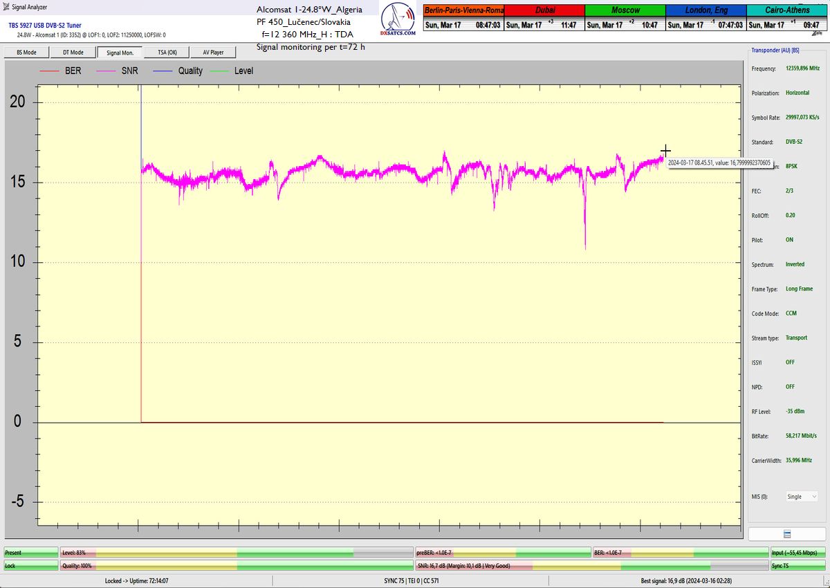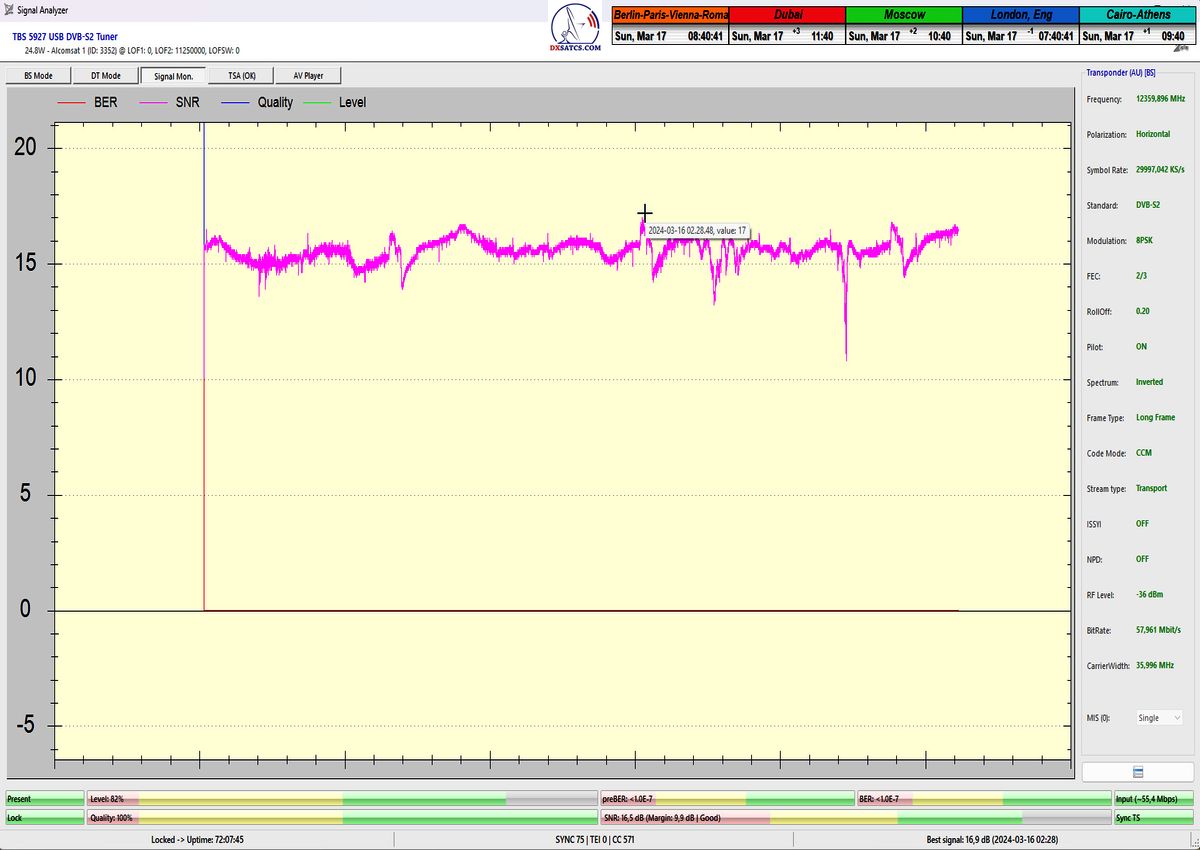 ►De_Klassifizierung der erreichten Ergebnisse bei f=12 360 MHz: Die visualisierte Form des Beweises im Signalmonitoring über eine Einheit von t=72 Stunden,ausgedrückt in Leistungs, Qualitäts und Fehlerverlaufs Trends,demonstriert und beweist gleichzeitig das Erreichen eines vorbildlichen Zustands des Satellitenempfangs,im Sinne eines Zustands,der als MUSTER dienen kann.Die nachgewiesene Empfangsstabilität von 100% mit einem hohen und typischen Qualitätsreserveniveau während des gesamten Tages erreichte Werte von 8 bis 10,4 dB in der Link/Rauschabstand-Messeinheit.Die Kontinuität aller überwachten Einheitstrends wurde durch zwei Wellen von Regenschauern mit relativ hoher Niederschlagsintensität am 16.März 2024 verifiziert.Die täglichen Qualitätspeaks erreichten Werte von 16,7 bis 17,0 dB in der SNR-Einheit und traten in zwei Intervallen auf: von 02:15 bis 02:45 nachts und von 8:45 bis 9:45 morgens.Auch im Fall der Überwachung der Frequenz f=12 360 MHz wurde die endgültige Form der Überwachung bereits beim ersten Versuch erreicht,ähnlich wie dies bei allen anderen Trägern des Satelliten Alcomsat 1 der Fall war.