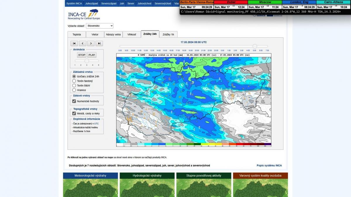 - okamžitá kvalita SNR=16,1 dB v čase okolo 11:00 CET pri intenzívnych dažďových prehánkach -