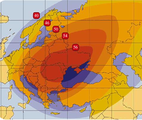 - umiestnenie RX zostavy v centrálnej zóne špičky EIRP toku s vyžiarenou úrovňou okolo 54-56 dBW umožňuje v kvalitatívnom vyjadrení jednotky Modulačná Chyba MER na príjmacej strane dosiahnúť výnimočné akostné rozpätia zisku od MER=18-24 dB pri FEC 3/4 čo je čistá hladina ziskového rastu od 12-18 dB nad pásmom uzamknutia QPSK nosnej pri MER=6 dB, pričom konkrétne v tomto prípade pri elevačnom uhle zostavy okolo 30° , čo následne súvisí s výsledným pomerom zisku k šumovej teplote G/T pri jednotlivých častiach RX signálneho reťazca ako anténneho reflektora , LNB atď. , je možné totálnu chybovú nulu BER na kanál=E-08 pred Vitterbi dekodérom resp.stanovenú energiu na bit dosiahnúť už pri MER=14+ dB a FEC 3/4 , čo by pri teoretickom predpoklade rovnakých hladín EIRP tokov z pozícií 4,0°W a 95,0°E v mieste príjmu Lučenec / so zanedbaním permanentného oscilačného rozkmitu amplitúdy Q-kvality vplyvom takmer nulového elevačného uhla / , v praxi znamenalo nemožnosť dosiahnutia porovnatelných kvalitatívnych výsledkov okamitej chybovosti BER na kanál a kvality MER prenosu s rovnakým RX signálnym reťazcom s PF 365 cm .