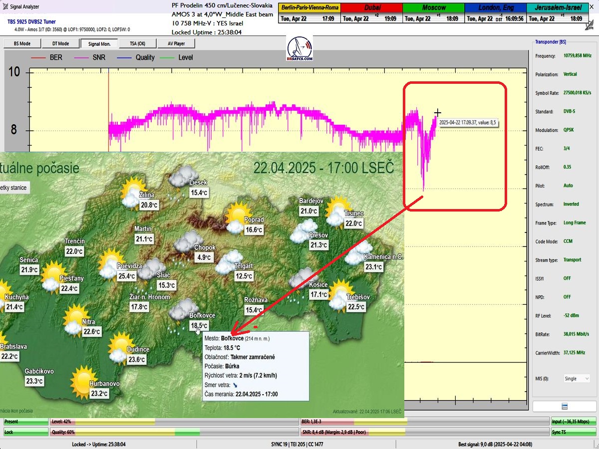 Ich habe die Ursachen der EIRP-Leistungsanomalie identifiziert und eliminiert, die über einen langen Zeitraum meine gesamte Forschung und jedes Signalüberwachungsmuster des YES-Netzwerks beeinträchtigt hat. Heute kann ich an einem Muster (bei f=10 758_V) und einem quasi-idealen Muster (bei f=10 722_V) zeigen, dass nach der Leistungsanomalie keine Spur mehr in der Signalüberwachung zu finden ist und die erhaltenen Muster genau die tatsächliche Leistung in Mitteleuropa widerspiegeln. Meine gesamte wissenschaftliche und Forschungsarbeit ist nun nicht mehr künstlich durch ein Problem beeinträchtigt, mit dem ich monatelang nicht zurechtkam, und die heute veröffentlichten Ergebnisse der Signalüberwachung sind der Beweis dafür.