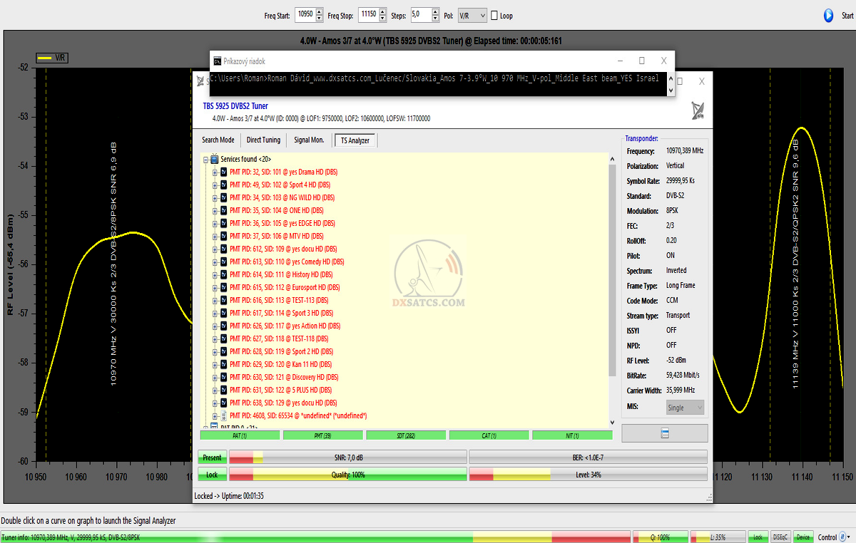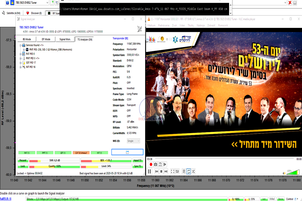 prenosu vo frekvenčnom spektre v definovanej zemepisnej polohe,na súčastnú a zároveň vôbec prvú demonštráciu uzamknutia a kvality príjmu nosnej izraelského tv paketu YES na f=11 554 MHz,ktoré kontinuálne,čiže bez výpadkov v možnosti uzamknutia,trvá od približne 6:00 ráno,už