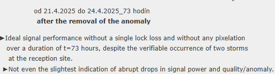 -okamžitá kvalita osciluje okolo: SNR=8,3-8,5 dB - pár minút po búrke v mieste príjmu ,ale ani len jedna pixelácia,alebo zamrznutie