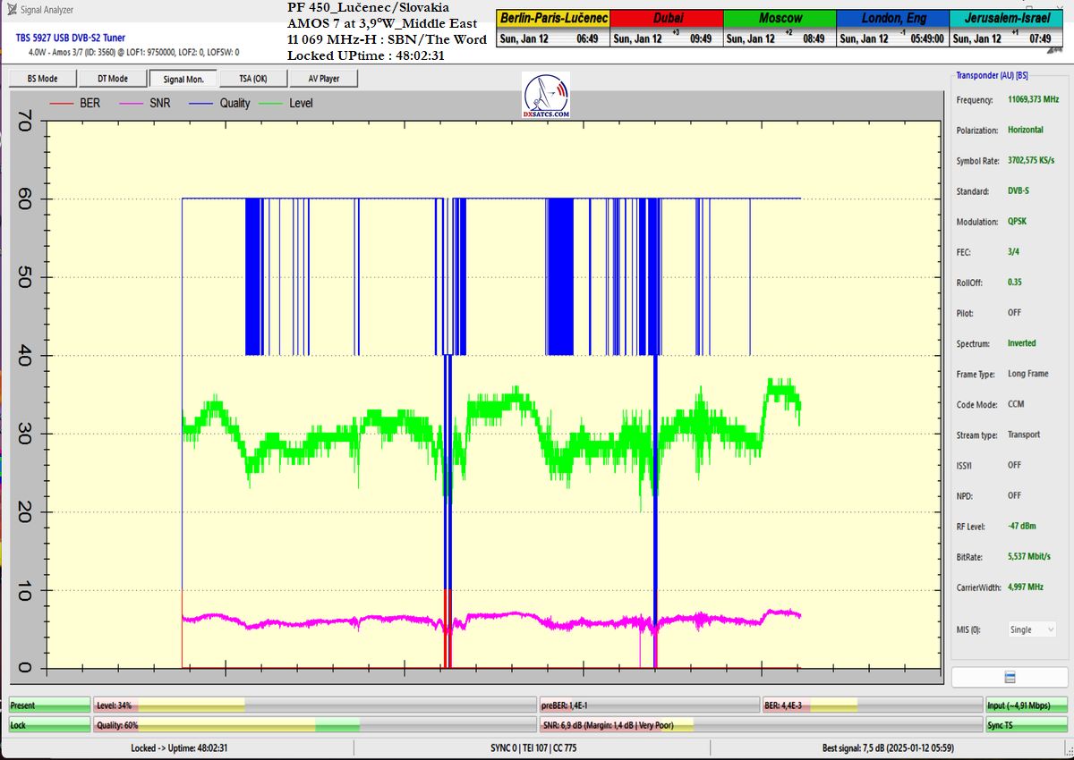 ►DE_Aus der Sicht der Erreichung einer langfristigen Signalstabilität auf dem Träger SBN/The Word Network handelt es sich um die Wellenform mit der höchsten Kanalfelderrate (ChBER) unter mitteleuropäischen Satellitenempfangsbedingungen. Anders ausgedrückt, es handelt sich um einen der technisch anspruchsvollsten Satellitenempfänge überhaupt. Trotz Schneeschauern am Empfangsort in Lučenec erreichte ich auf f = 11,069 MHz-H eine Signalstabilität von über 99 % in der Nachweiseinheit t = 100+ h.