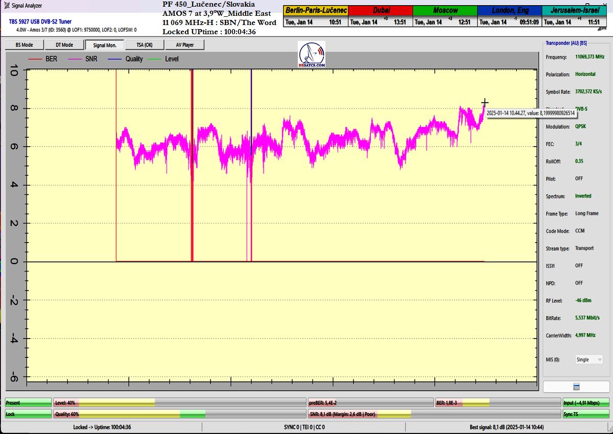 In the verification and signal monitoring period of t=101 hours, I achieved an overall reception stability of 99.40594%, expressed in percentage terms. In other words, I achieved full reception stability of SBN/The Word without a single pixelation or lock drop for a duration of 100 hours and 24 minutes out of the total 101-hour monitoring period.