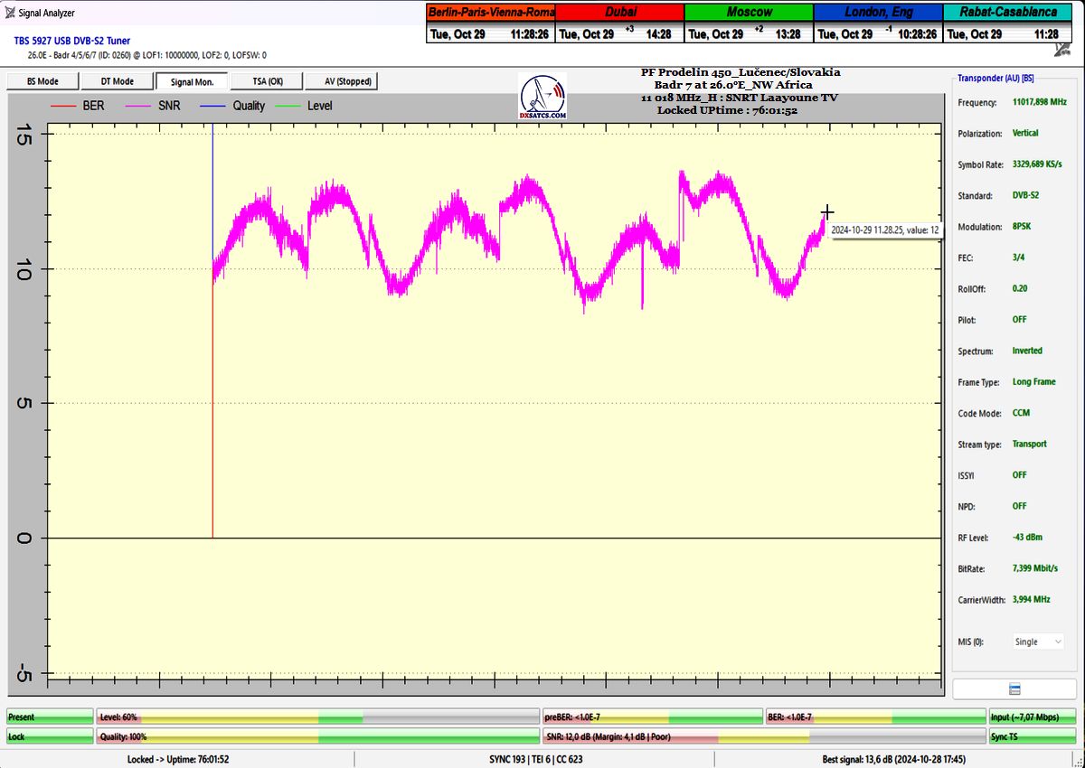 Answer: Because the data I insert or replicate into the antenna system have a limited validity period, typically 7 to 16 hours, I must regularly update them depending on the specific wave conditions. Since the signal model I initially created is accurate, I know for certain that I must replicate the updated data into the system no later than 3:30 AM CET, allowing for sufficient lead time. As you can see in the monitoring, after 4:00 AM, there is no lock and no reception at the output of the PF 450 cm, due to the fact that there is a massive drop in performance every morning, and at the same time, the data in the antenna system have not been updated. This demonstrates that the preparation and modeling of an accurate signal model at the beginning is the most crucial part of the entire setup. Subsequently, as you can see, my technological invention not only ensures a significant immediate increase in signal quality by 1-3.6 dB but also the continuity/stability of the carrier lock during high and daily fluctuations in performance in Central Europe. Today, I can demonstrate full reception stability and continuity of the carrier lock function for a duration of t=76 hours.