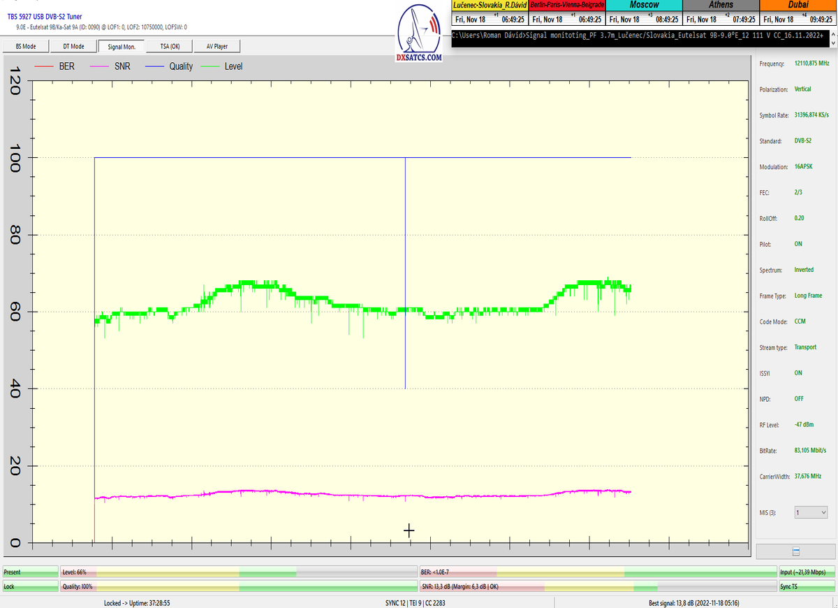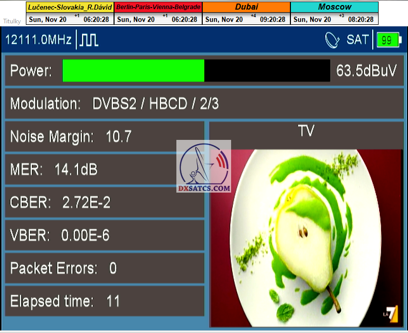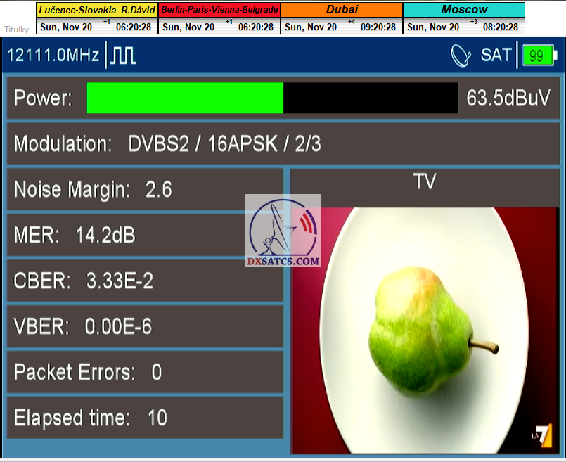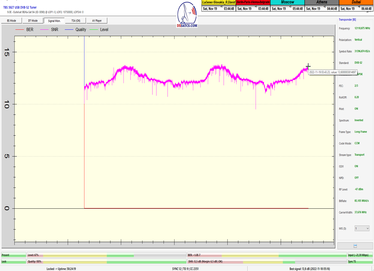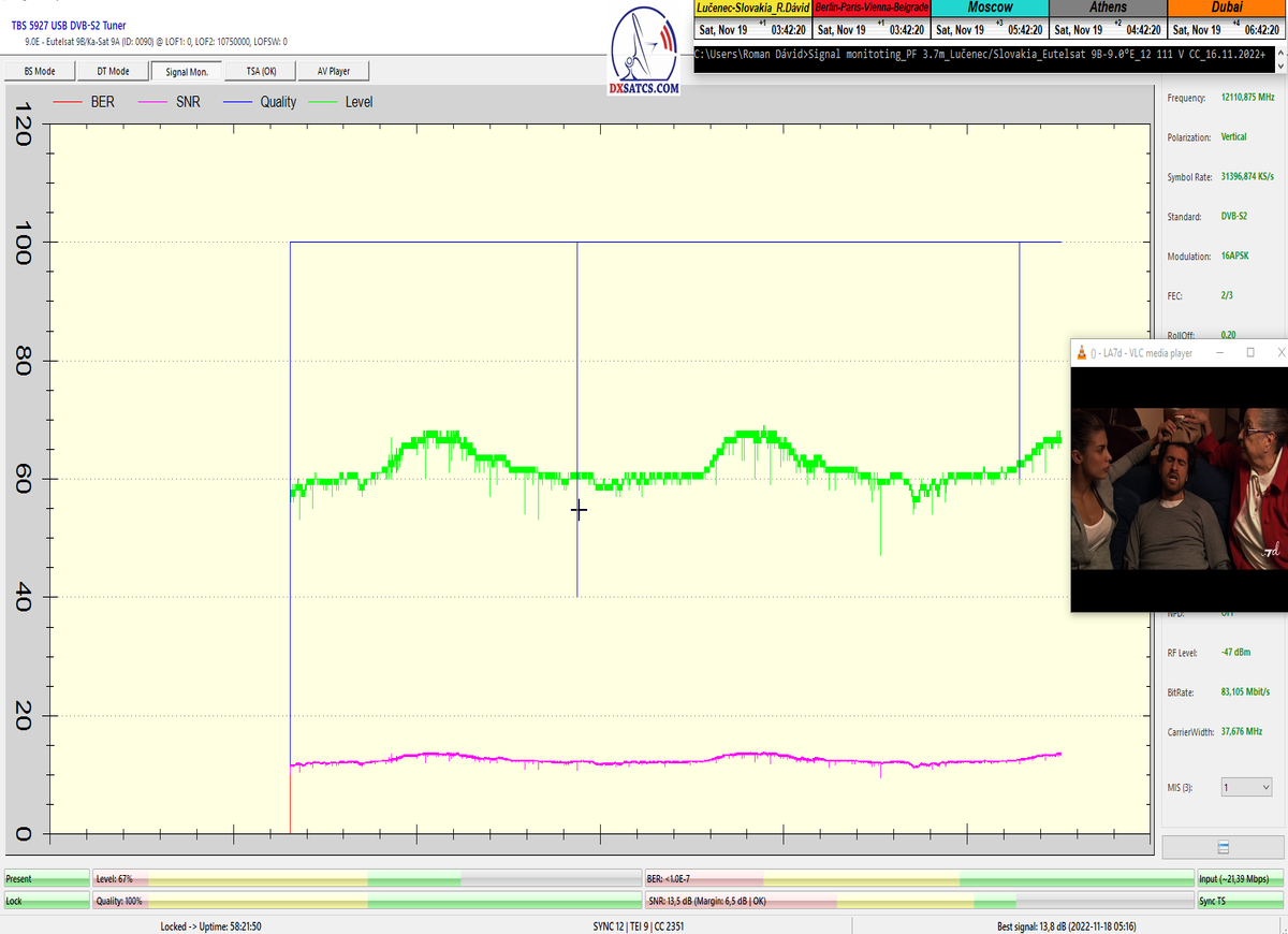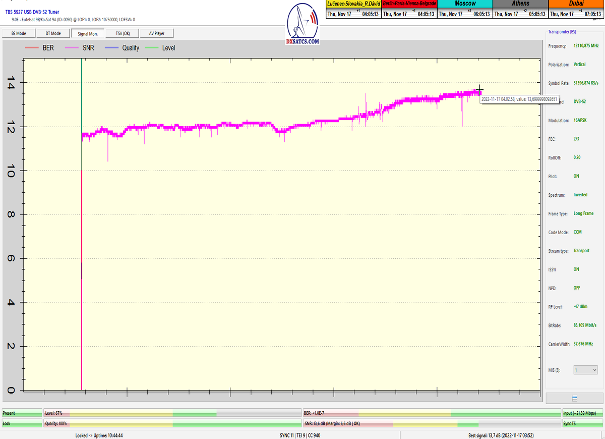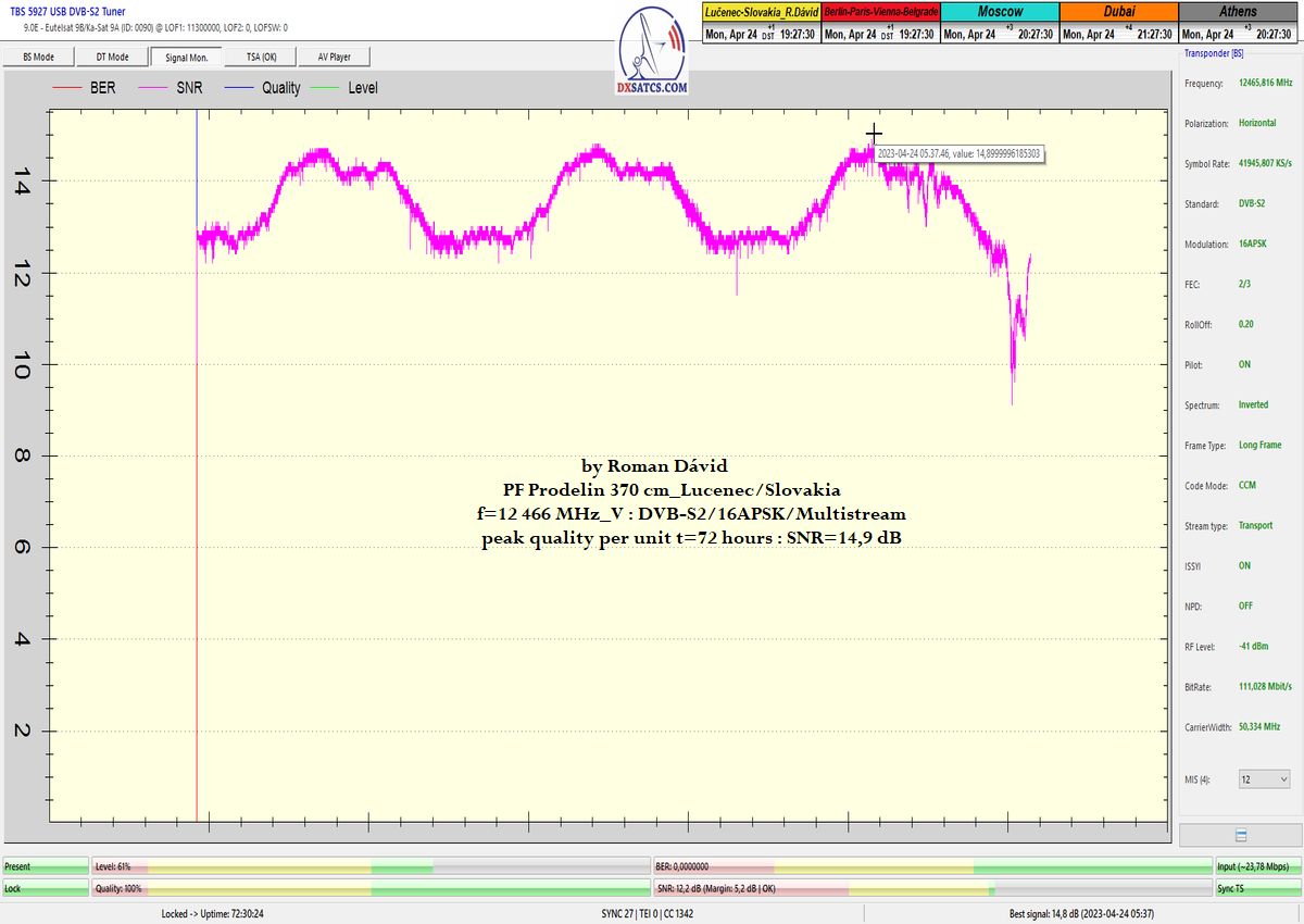 ►v signálnom monitoringu dokázaný a plne stabilný príjem bez jediného výpadku za jednotku t=72 hodín,pri častých dažďových prehánkach a každodenne dosiahnutá špička kvality okolo SNR=13,8 dB s tunerom TBS 5925/5927 alebo okolo MER=14,2 s analyzátorom Metek HD na f=12 111 V .