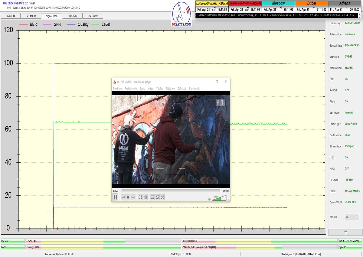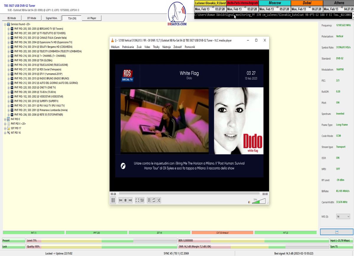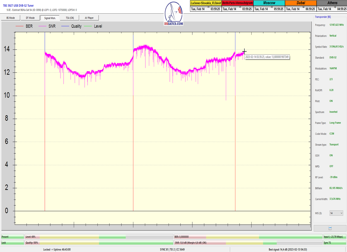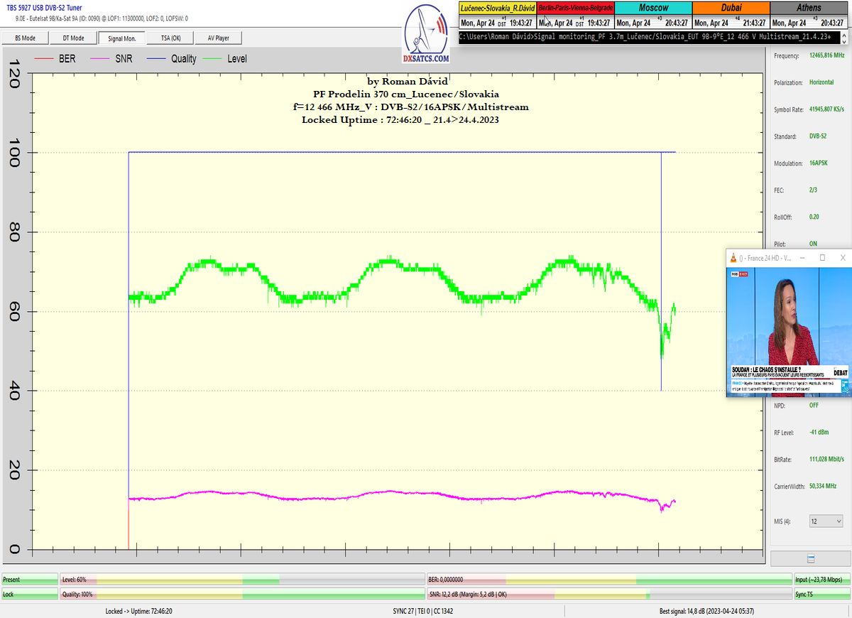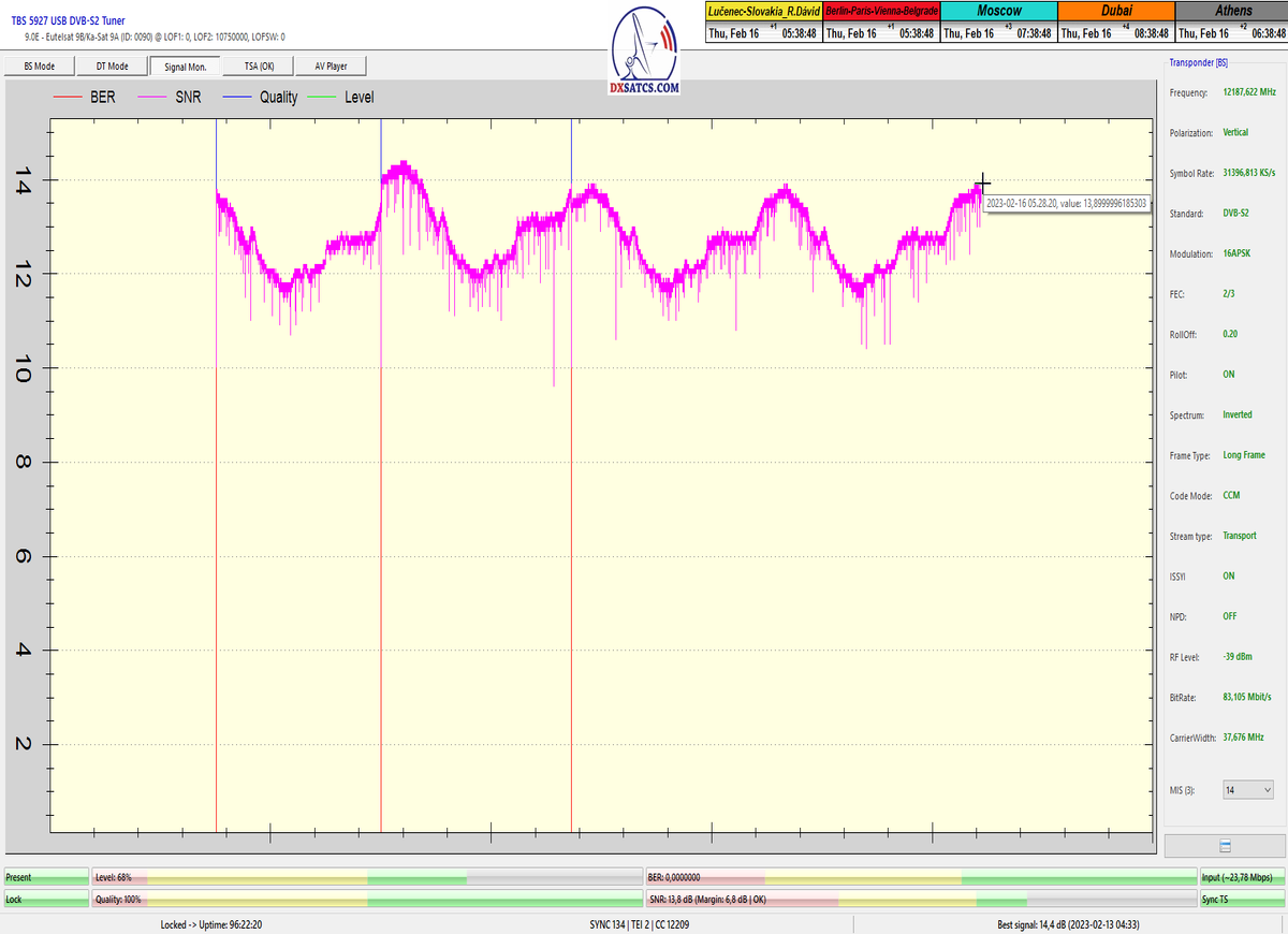 ►v signálnom monitoringu dokázaný a plne stabilný príjem bez jediného výpadku za jednotku t=72 hodín,pri častých dažďových prehánkach a každodenne dosiahnutá špička kvality okolo SNR=13,8 dB s tunerom TBS 5925/5927 alebo okolo MER=14,2 s analyzátorom Metek HD na f=12 111 V .