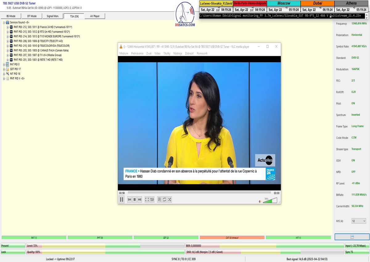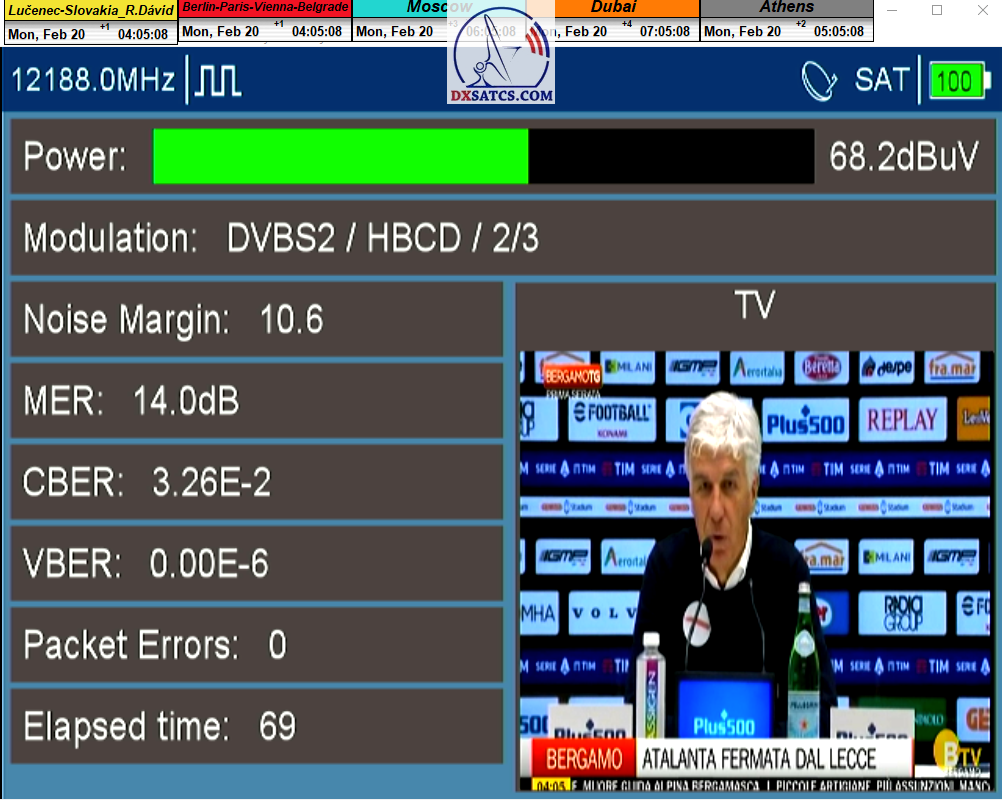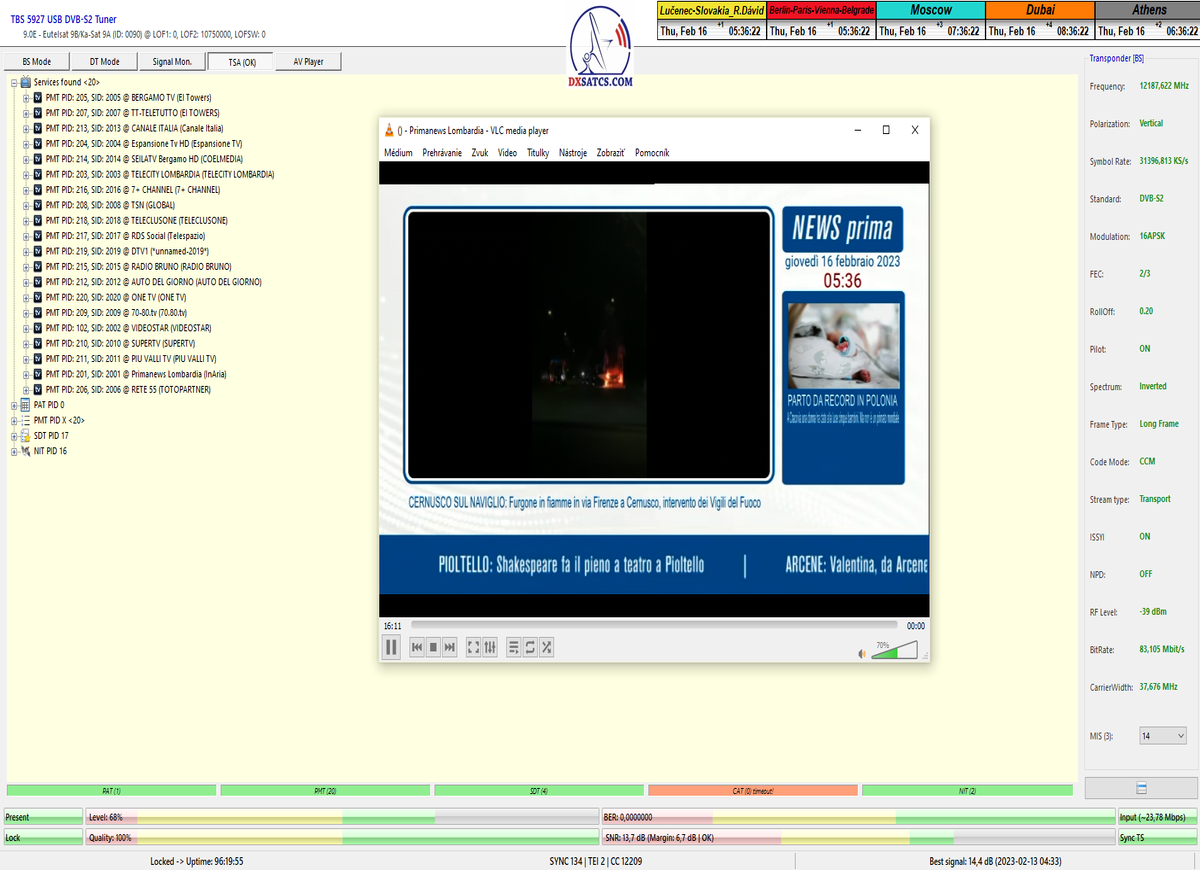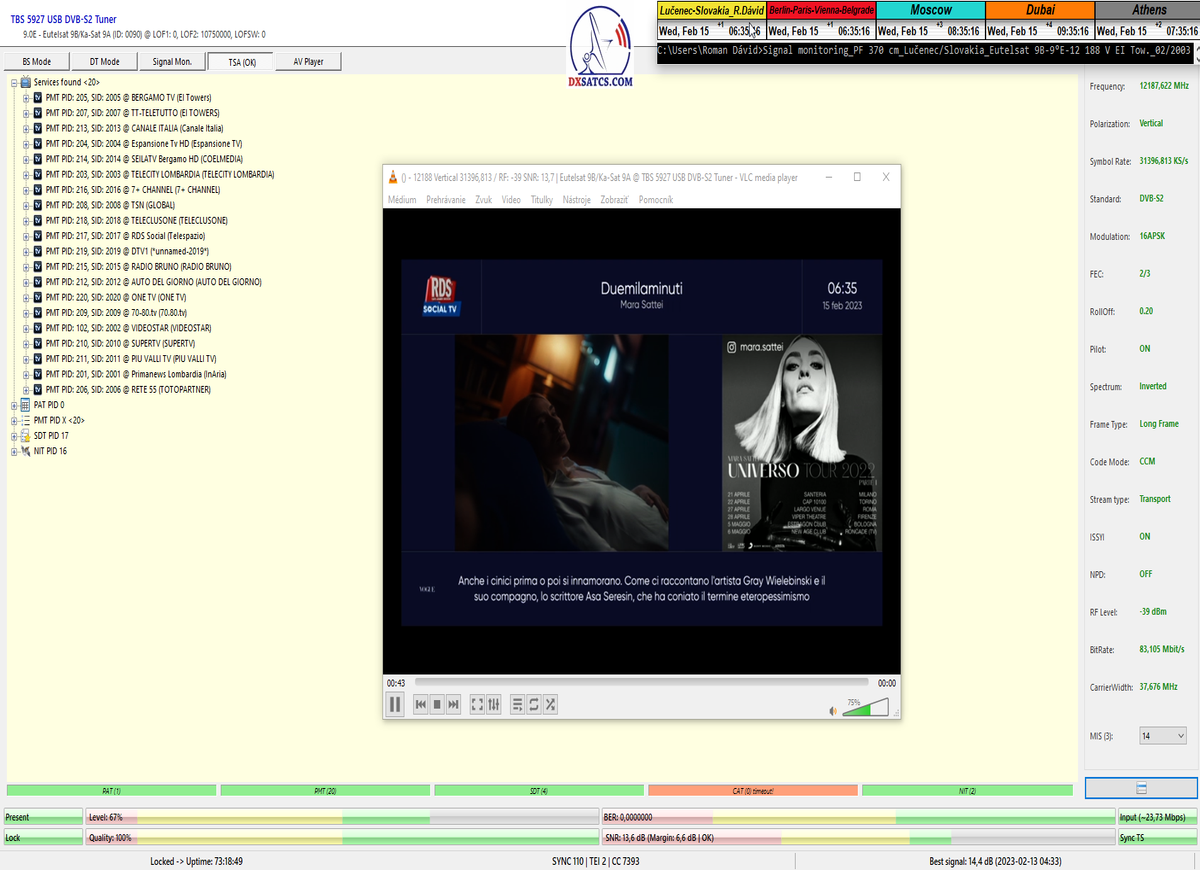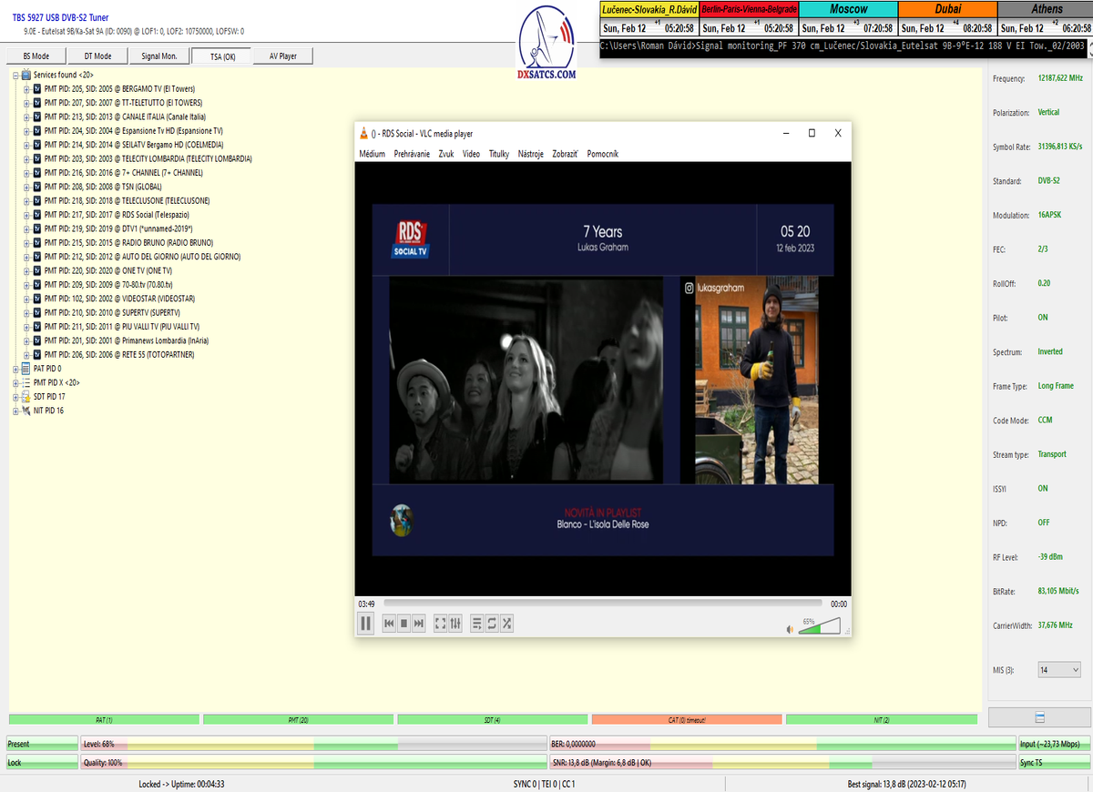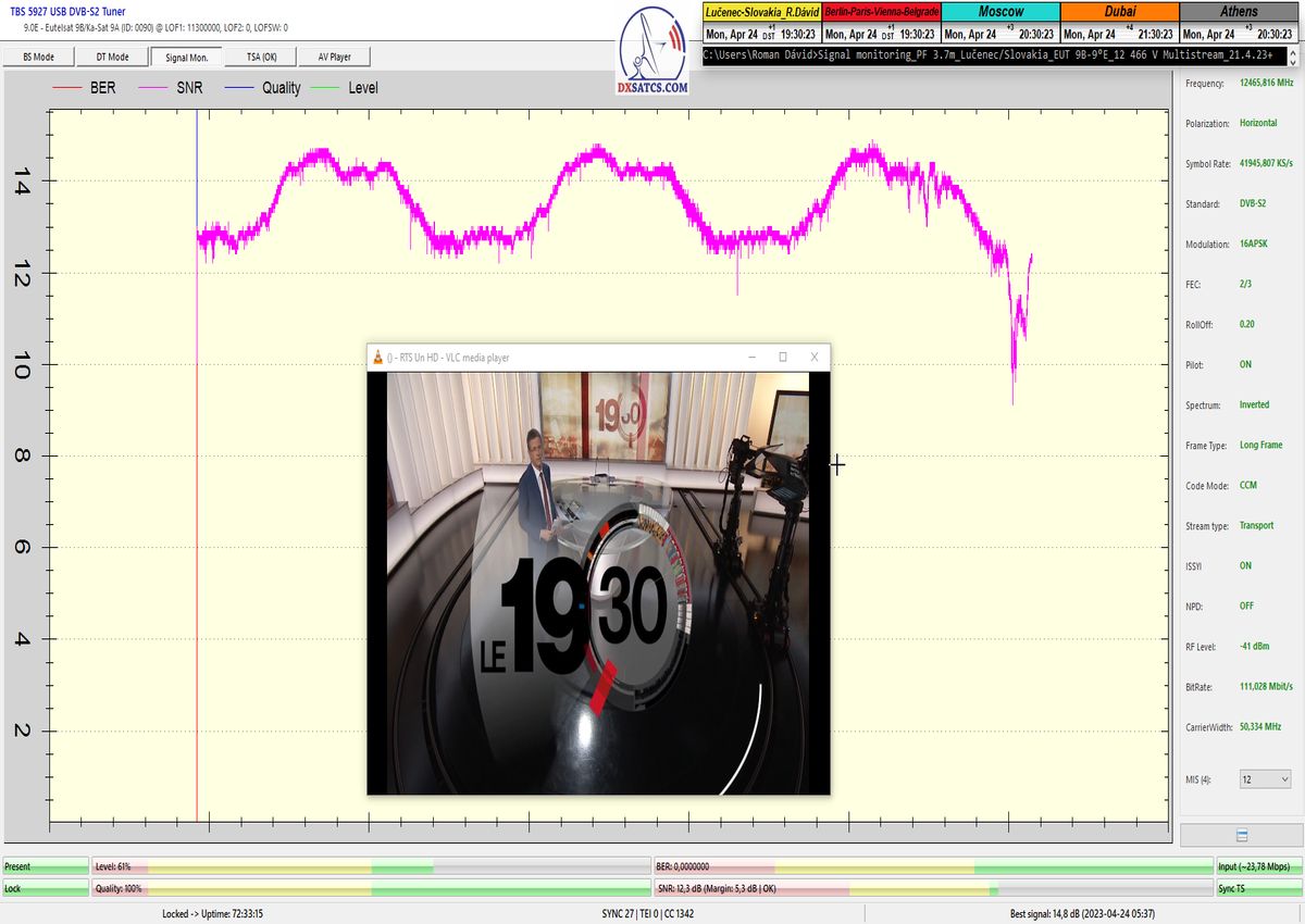 ►v signálnom monitoringu dokázaný a plne stabilný príjem bez jediného výpadku za jednotku t=72 hodín,pri častých dažďových prehánkach a každodenne dosiahnutá špička kvality okolo SNR=13,8 dB s tunerom TBS 5925/5927 alebo okolo MER=14,2 s analyzátorom Metek HD na f=12 111 V .