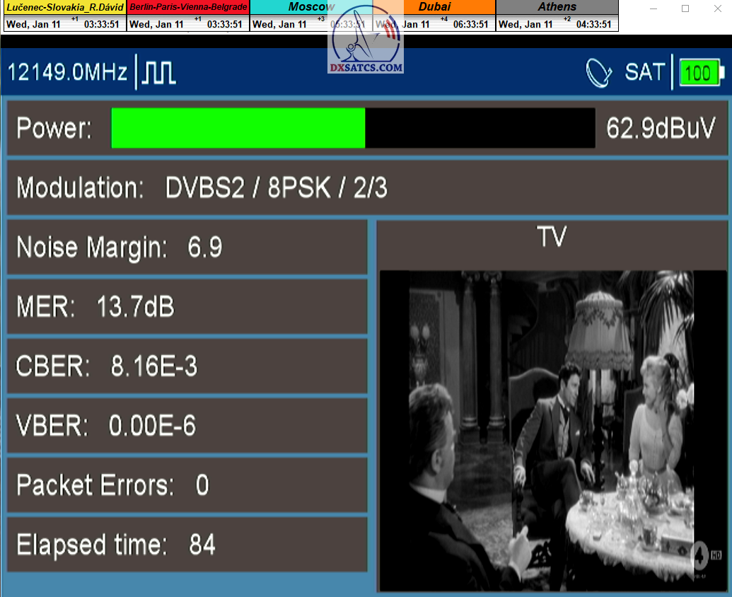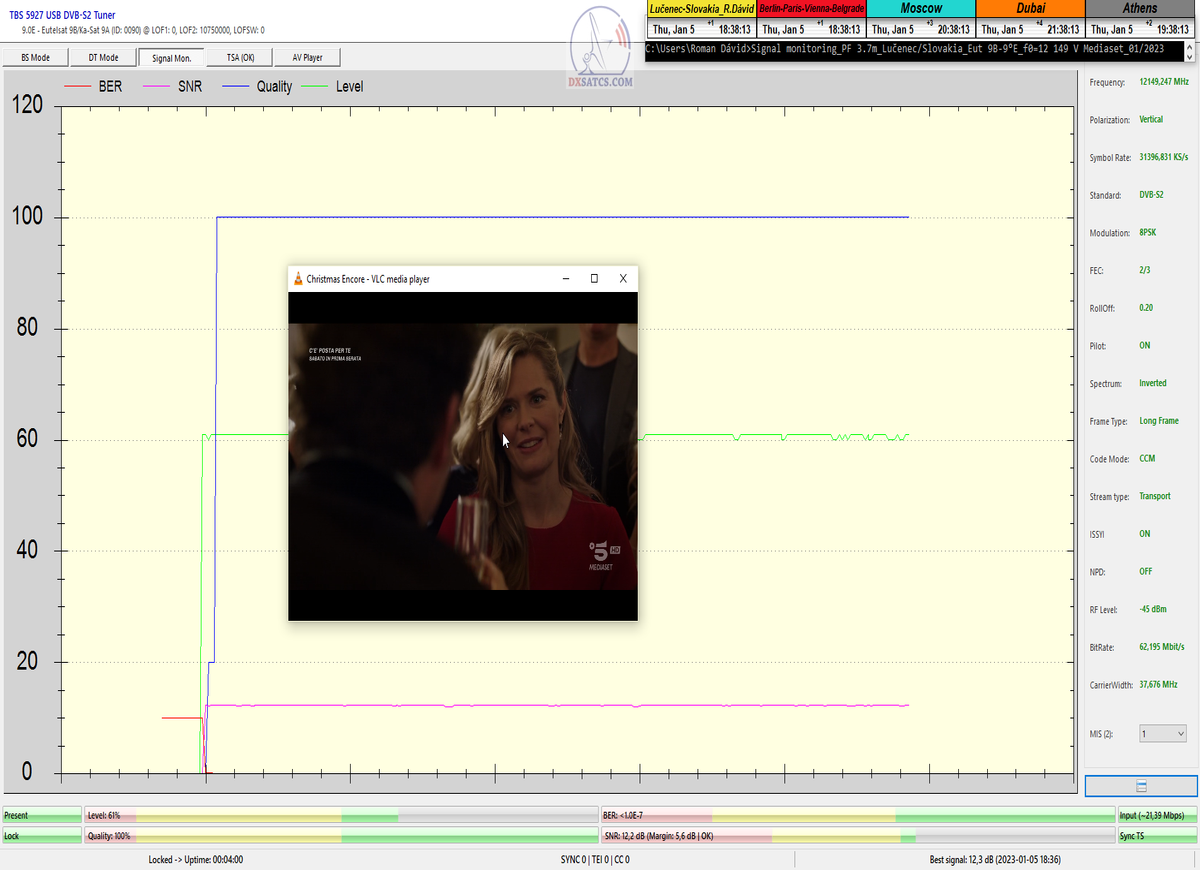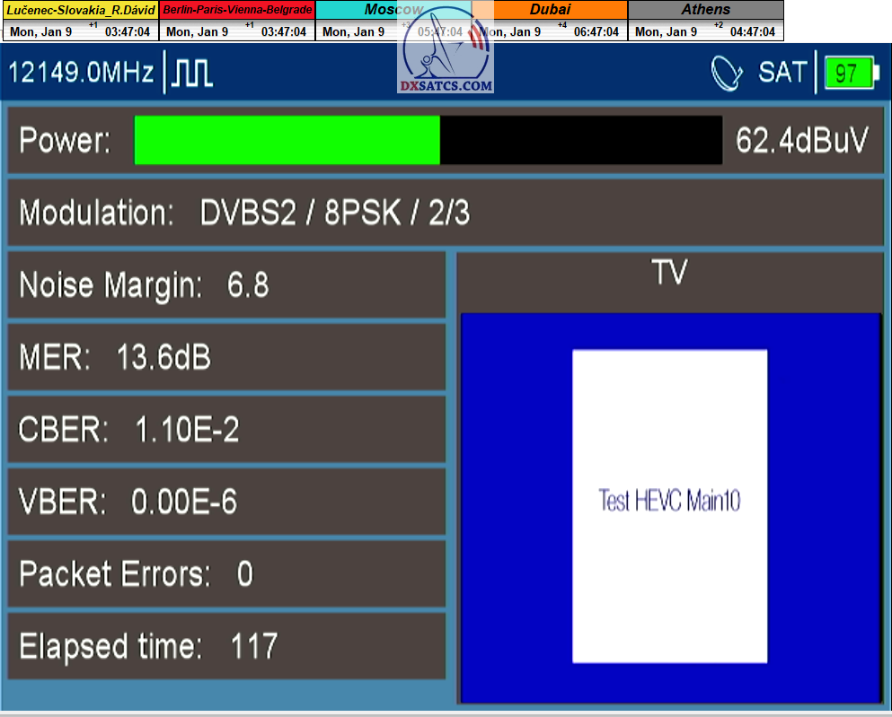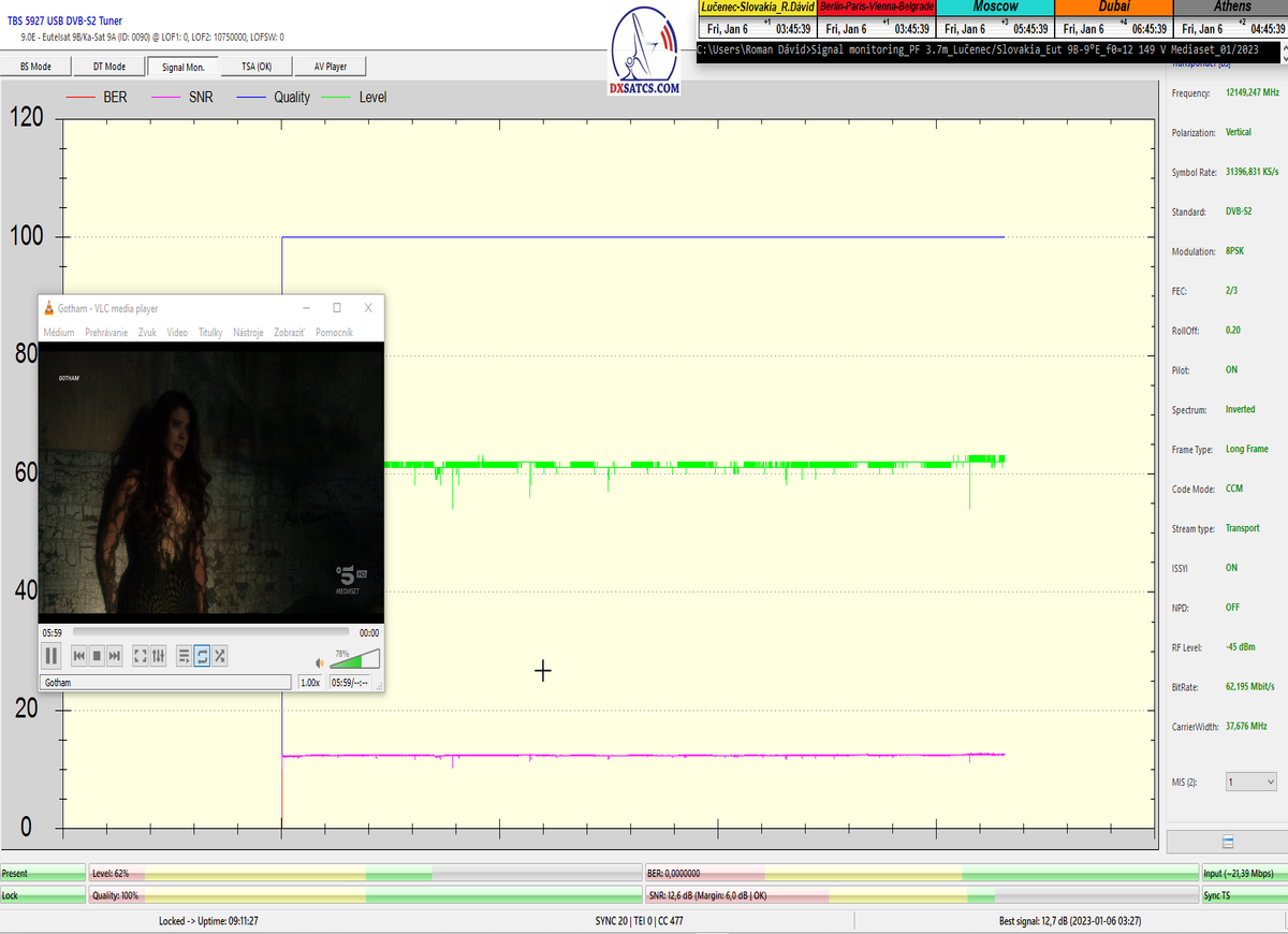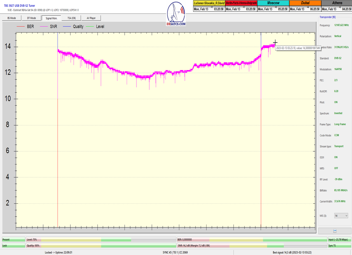 ►Analýza : v prvej polovici časového úseku od 5.1.2023 do 11.1.2023 som koncentroval signálne dáta v kontinuálnom monitoringu v kvantite 1x72 hodín,ktorý má za úlohu nespochybnitelne dokázať exemplárnu a každodennú stabilitu príjmu bez jedinej pixelácie a výpadku v spojitosti priebehu s typickou špičkou kvality od 12,7 do 13 dB v závislosti od okamžitých poveternostných podmienok na výstupes tunera TBS 5927 a v druhej polovici časového úseku od 9.1.2023 do 11.1.2023 som si dal za úlohu dokázať typickú,alebo každodenne sa opakujúcu špičku kvality od MER=13,4 do MER=13,8 dB na výstupe z multistream analyzátora METEK,v závislosti od momentálneho stavu v atmosfére.