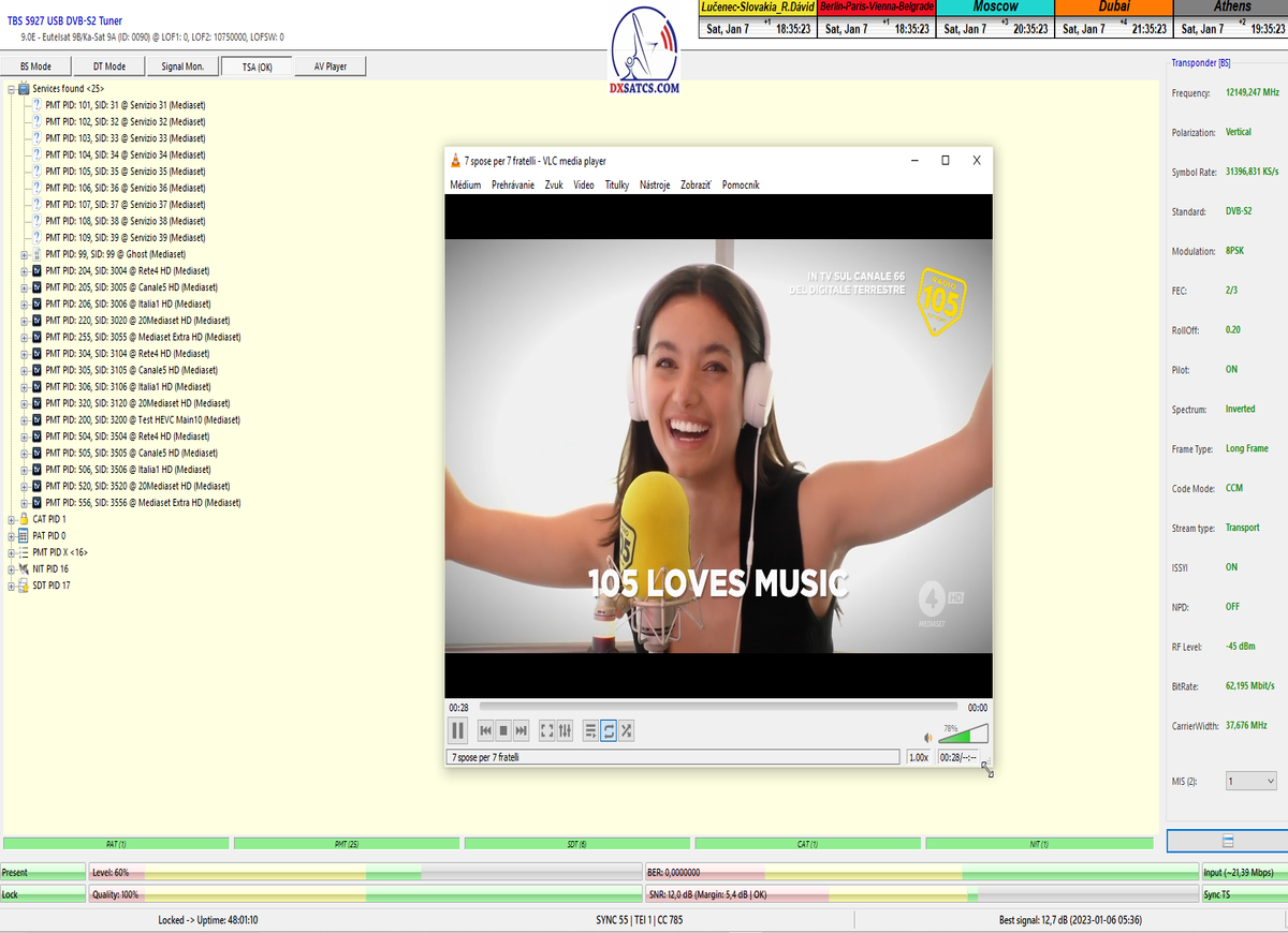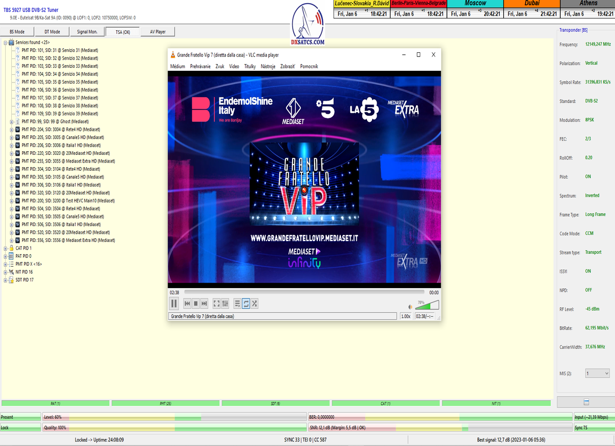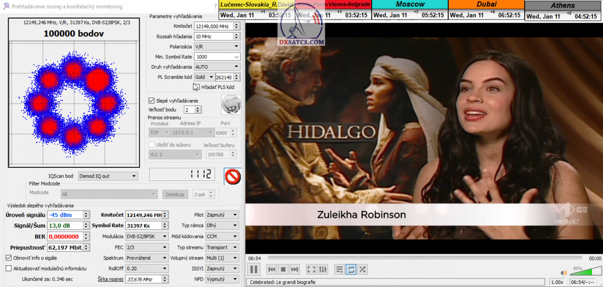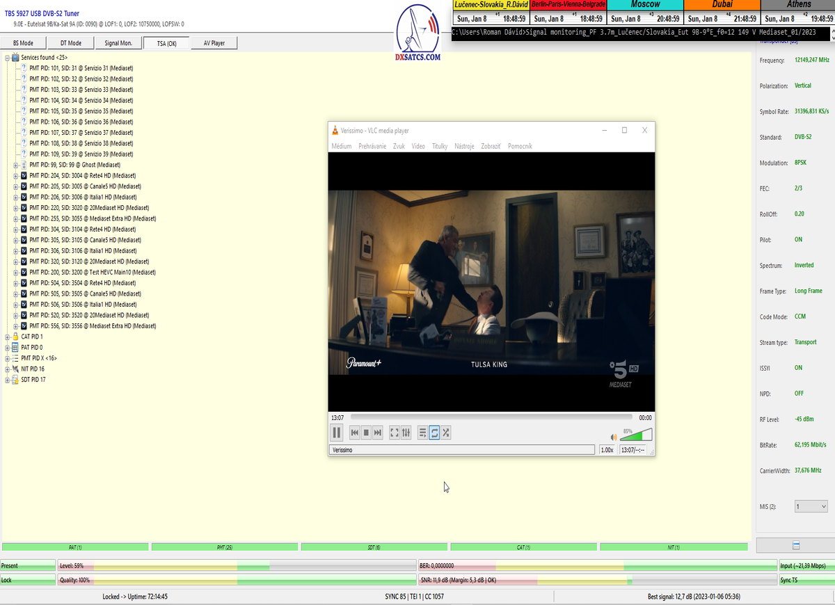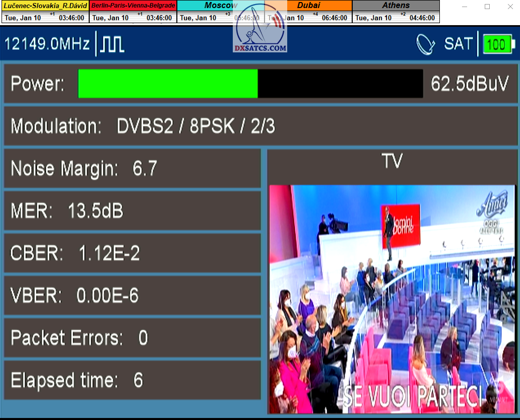 ►Analýza : v prvej polovici časového úseku od 5.1.2023 do 11.1.2023 som koncentroval signálne dáta v kontinuálnom monitoringu v kvantite 1x72 hodín,ktorý má za úlohu nespochybnitelne dokázať exemplárnu a každodennú stabilitu príjmu bez jedinej pixelácie a výpadku v spojitosti priebehu s typickou špičkou kvality od 12,7 do 13 dB v závislosti od okamžitých poveternostných podmienok na výstupes tunera TBS 5927 a v druhej polovici časového úseku od 9.1.2023 do 11.1.2023 som si dal za úlohu dokázať typickú,alebo každodenne sa opakujúcu špičku kvality od MER=13,4 do MER=13,8 dB na výstupe z multistream analyzátora METEK,v závislosti od momentálneho stavu v atmosfére.