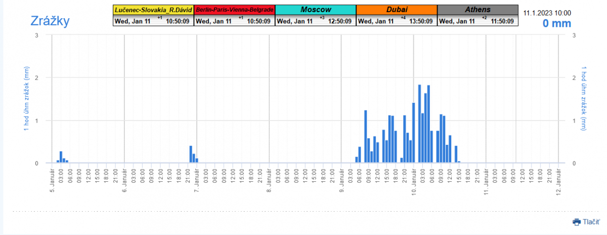 ►Meteogram úhrnu zrážok,rýchlosti vetra a teploty zo zdroja shmu.sk vygenerovaný dňa 11.1.2023 pre zemepisnú oblasť výkonu signálneho