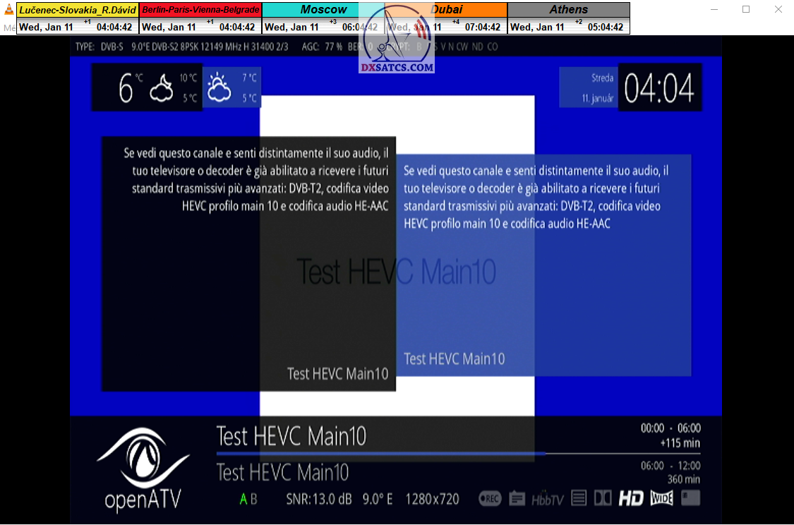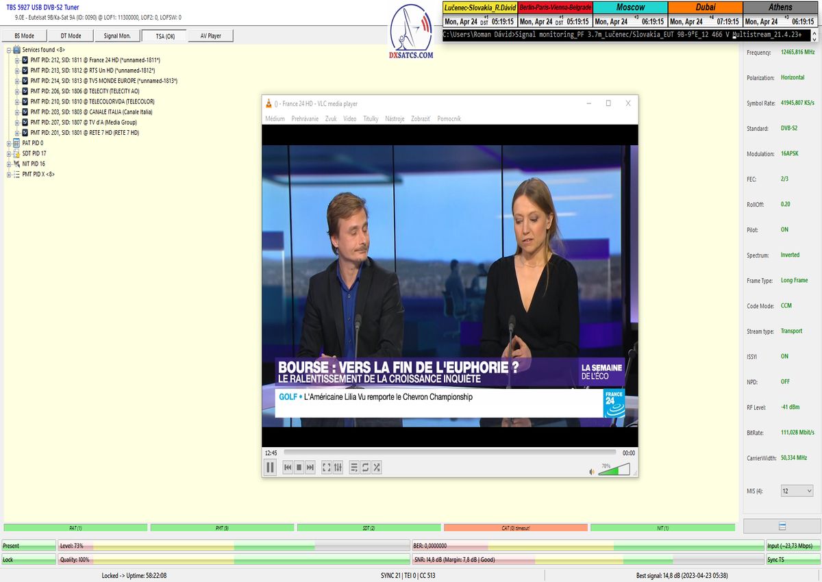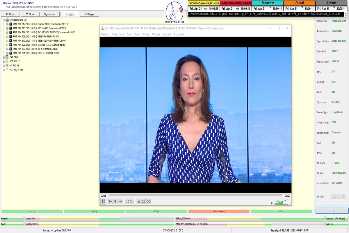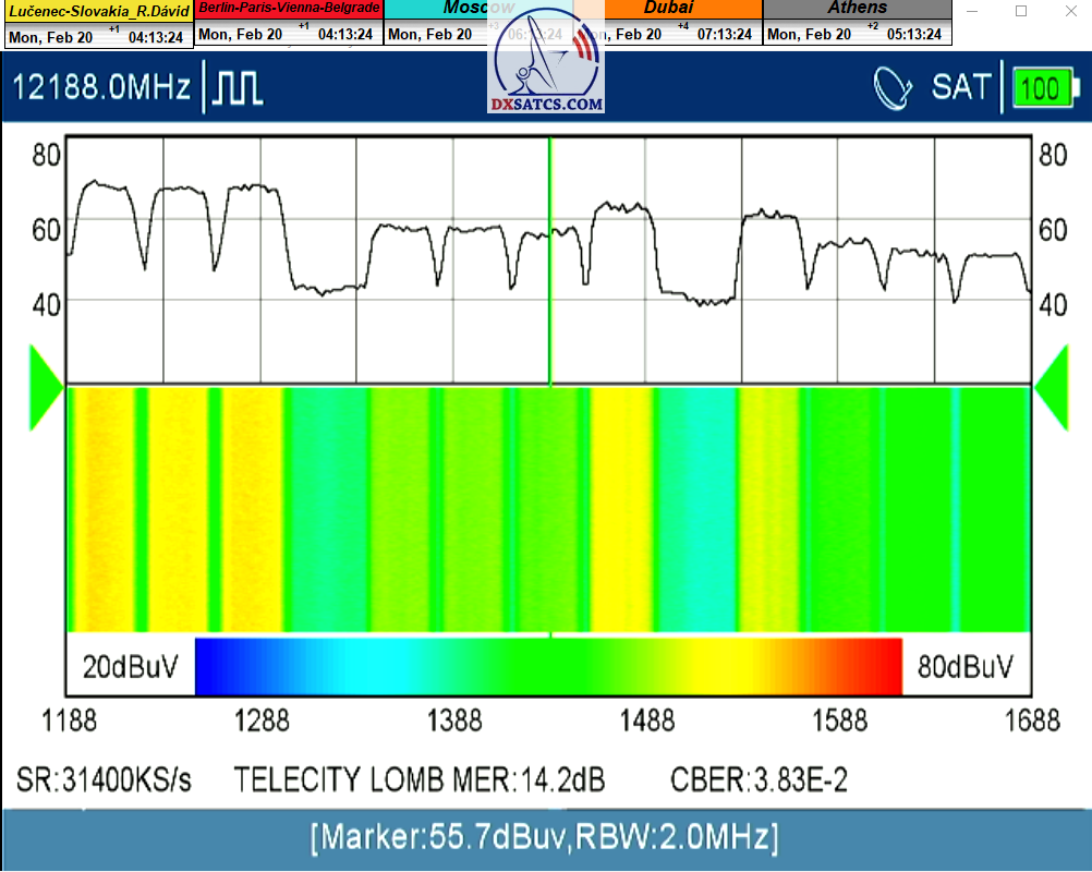 formy príjmu typicky 8-10 hodín,každý monitorovaný deň (bez jedinej pixelácie) so špičkou kvality SNR=7,8-8,2 dB v rozsahu od približne