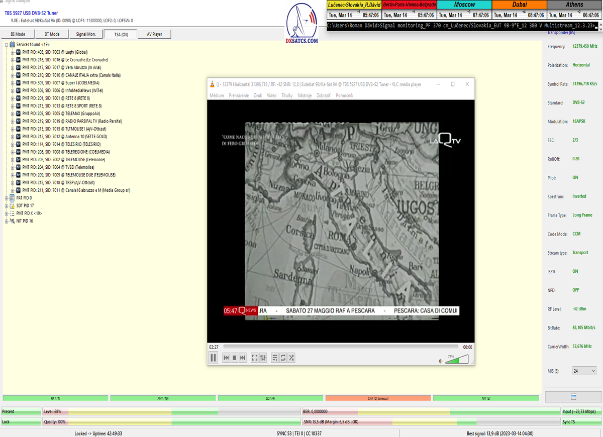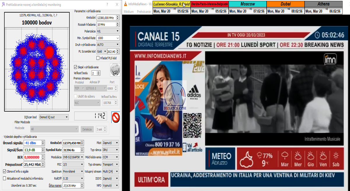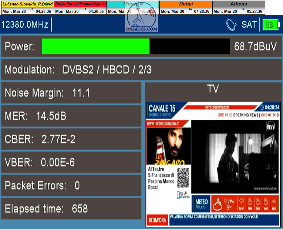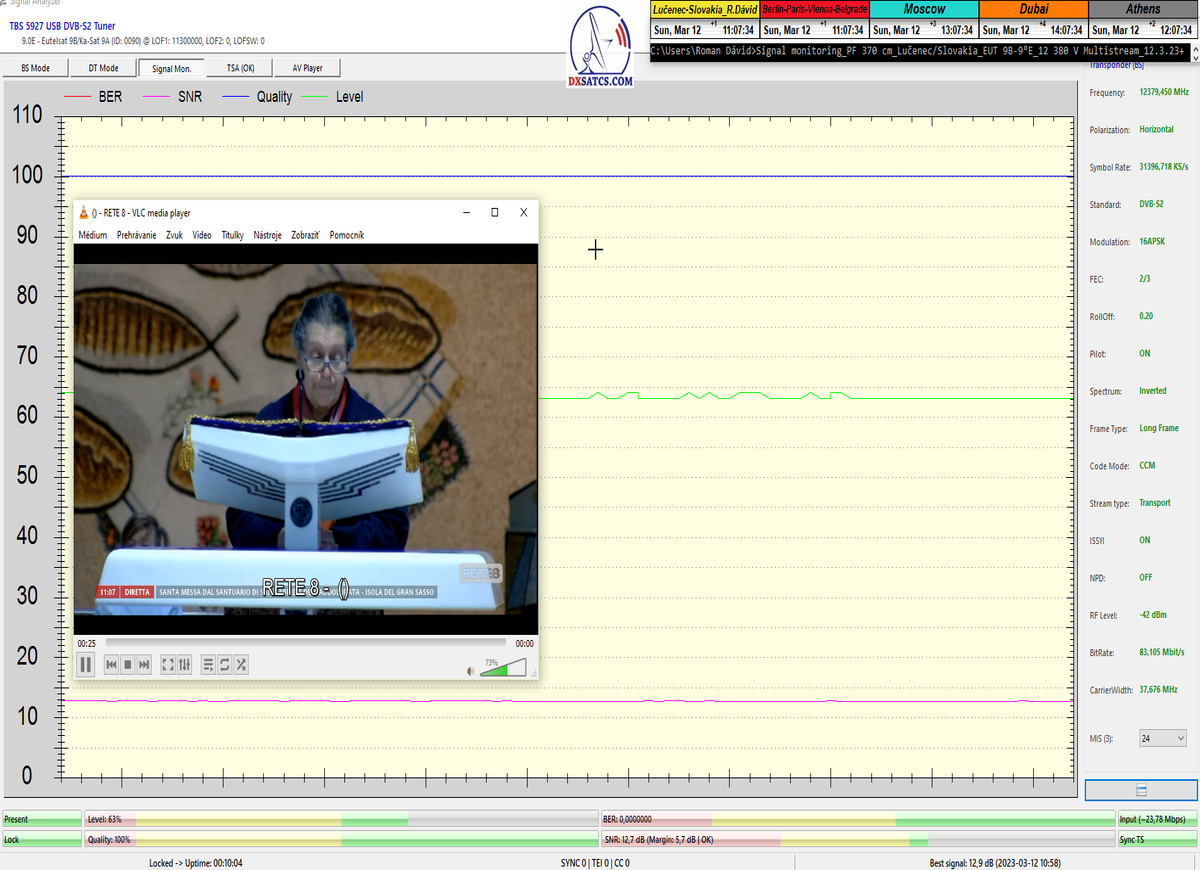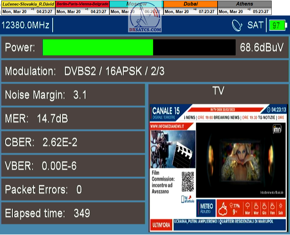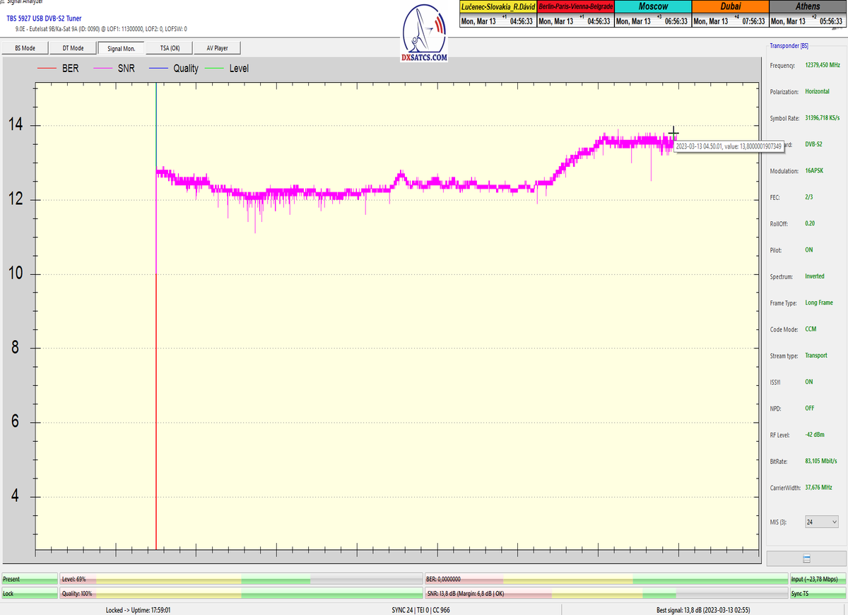 ►22.3.2023 : výsledky signálneho monitoringu frekvencie f=12 380 MHz_V v kvantite t=1x72 hodín na výstupe zo symetrického reflektora s D=370 cm týmto potvrdzujú správnosť mojich predošlých záverov o výskyte javu (ne) cyklických anomálií v rovnakom časovom úseku,alebo inak povedané (ne) pravidelných a dokázateľne vysokých výkonnostných odchýlok-poklesoch od typicky demonštrujúceho sa normálu v intenzite EIRP v danom čase a v danom zemepisnom bode a pravdivosť mojich záverov dokazuje najnovší signálny monitoring v ktorom nie je ani len náznak po jave anomálií,ktorý vznikal a zanikal od cca 12:35 do cca 12:45 SEČ . Pochopiteľne kvantita monitoringu t=72 hodín mi nedovoľuje stanoviť akékoľvek formy kategorických záverov tejto témy,ale s určitosťou môžem potvrdiť že v spomínanom časovom úseku ich predošlého výskytu dnes nie je už ani len náznak po skokovom poklese v intenzite EIRP. Jednu sekundovú mikro-pixeláciu pri úrovni kvality okolo SNR=13,2 dB,ktorá vznikla pri príchode brázdy nízkeho tlaku vzduchu v noci dňa 15.3.2023 (dažďové prehánky) môžem zanedbať a dosiahnutý výsledok klasifikovať ako kvázi exemplárny s každodennou amplitúdou špičky kvality okolo SNR=14 dB na výstupe z DVB-S2 tunera TBS 5927