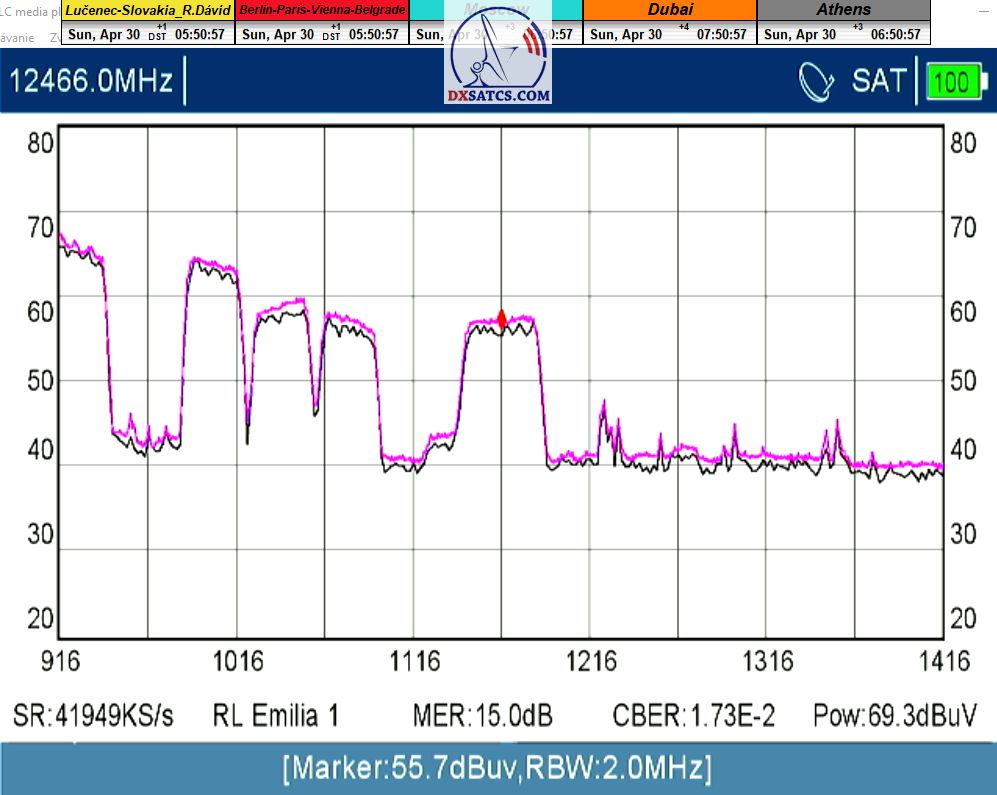 Dôkaz pravdivosti mojich tvrdení : tri dni za sebou v časovom úseku od 4:30 do 06:30 som dosiahol rovnakú špičku kvality MER=15,1 dB na f=12 466 MHz,čo jednoznačne vylučuje faktor výskytu náhodnej špičky výkonu_ 30.4.2023 > 1.5.2023 > 2.5.2023