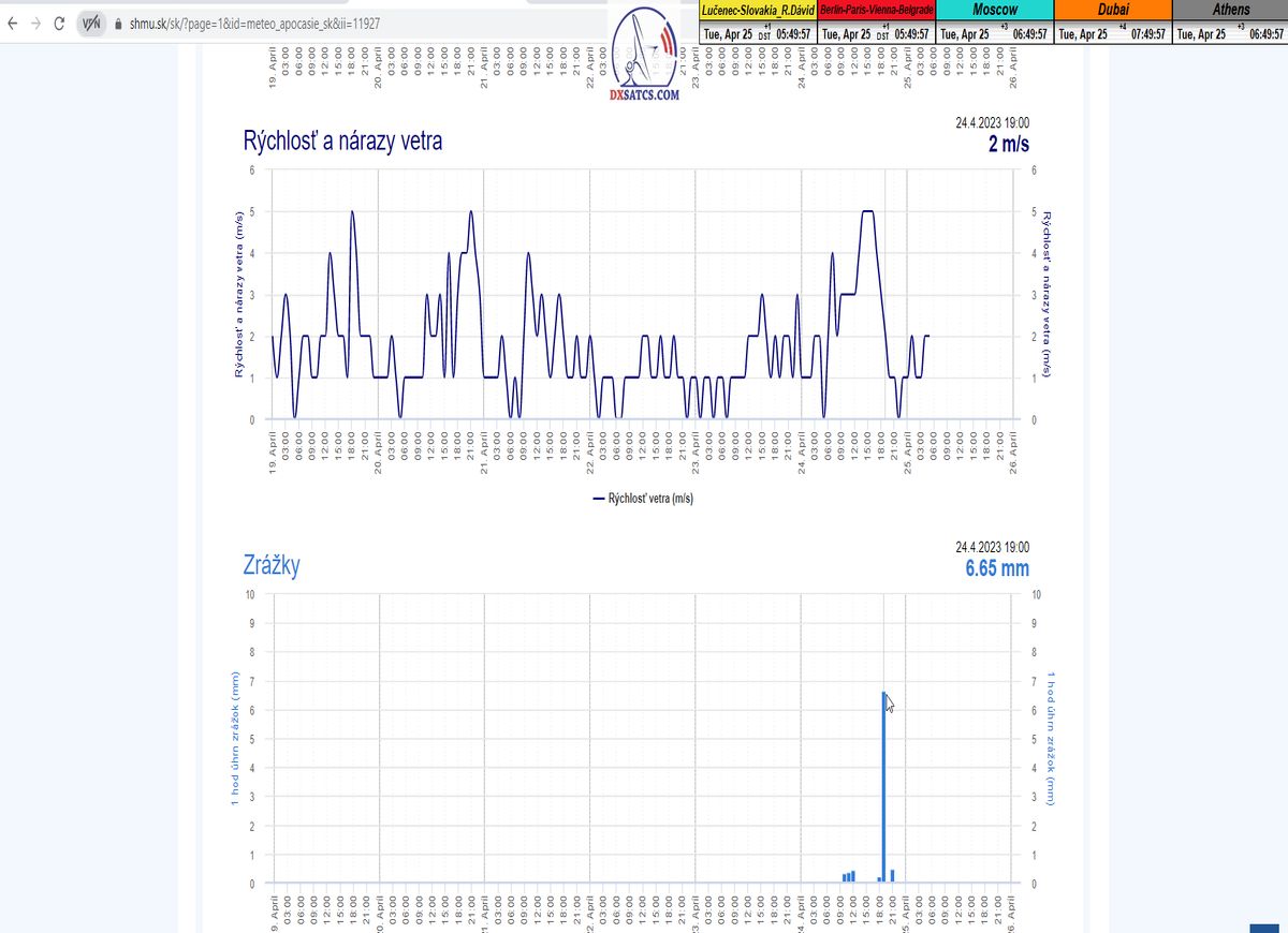 ►Meteogram úhrnu zrážok a rýchlosti vetra zo zdroja shmu.sk vygenerovaný dňa 25.4.2023 pre zemepisnú oblasť výkonu signálneho