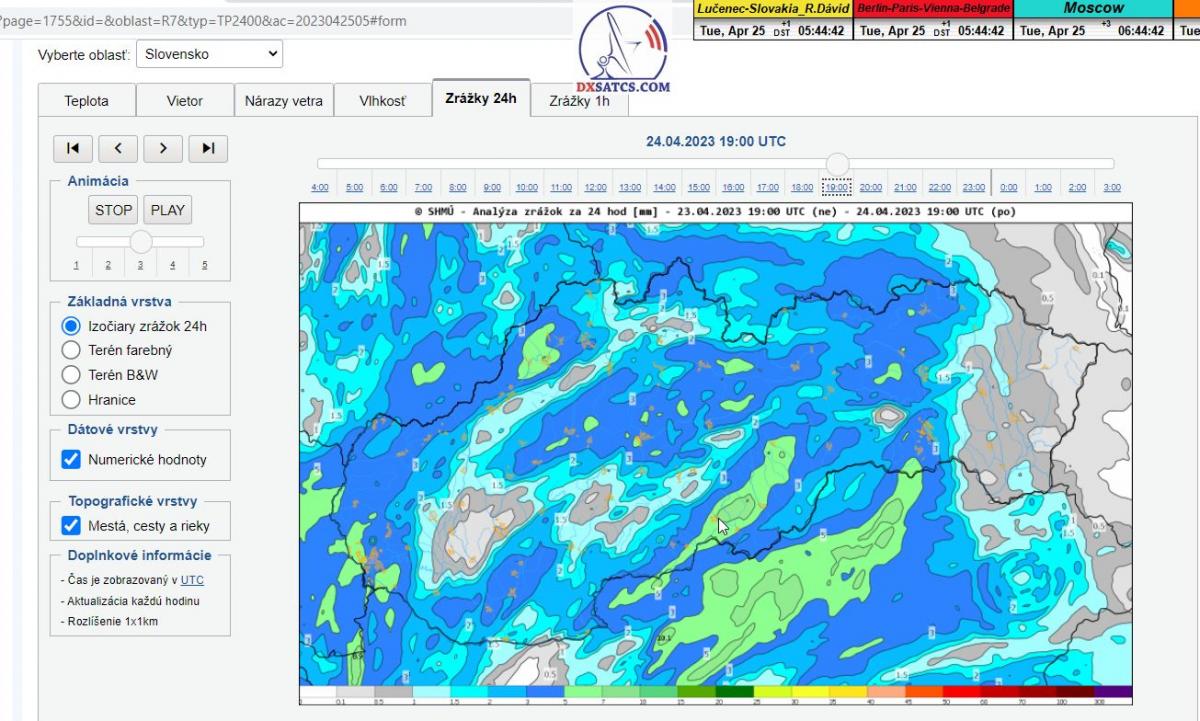 24.4.2023 stav v úhrne zrážok o 19:00 SEČ _ AWS 2 Boľkovce / zdroj shmu.sk