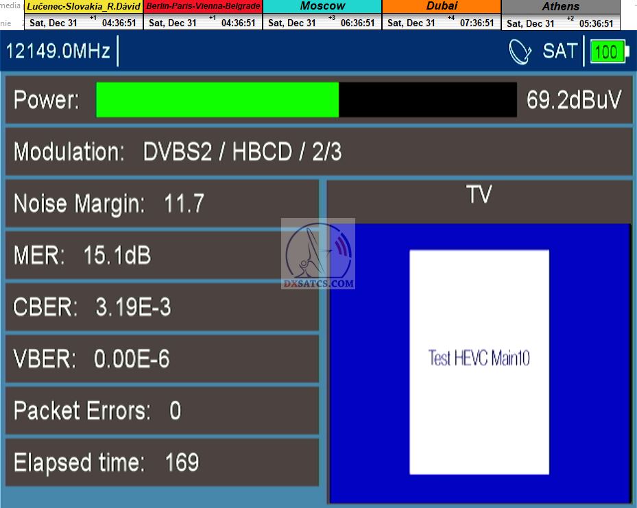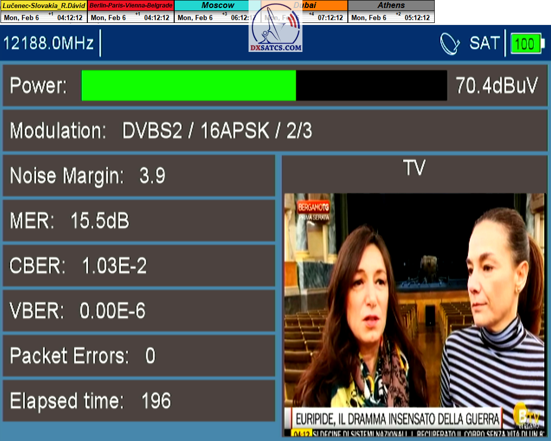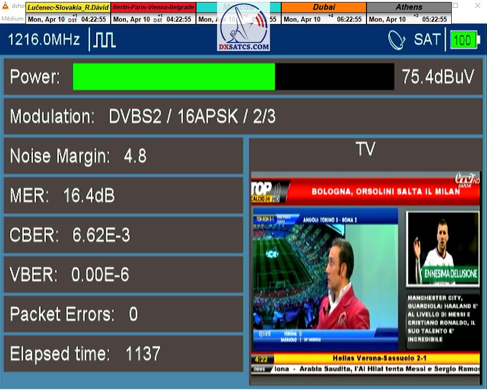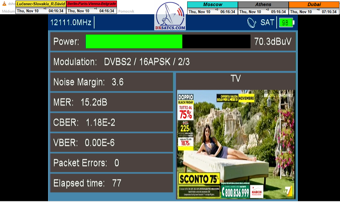 v signálnom monitoringu dokázaný a plne stabilný príjem bez jediného výpadku za jednotku t=72 hodín,pri častých dažďových prehánkach a každodenne dosiahnutá špička kvality okolo SNR=13,8 dB s tunerom TBS 5925/5927 alebo okolo MER=14,2 s analyzátorom Metek HD na f=12 111 V .