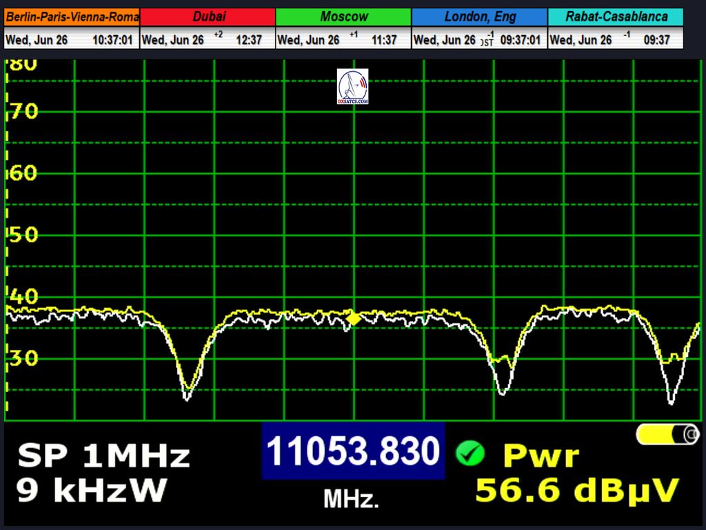 radio carrier Q-Music NL AMS at f=12,567.994 MHz through LOF2 and 12,567.941 MHz through LOF1, resulting in an offset of exactly 53 kHz between