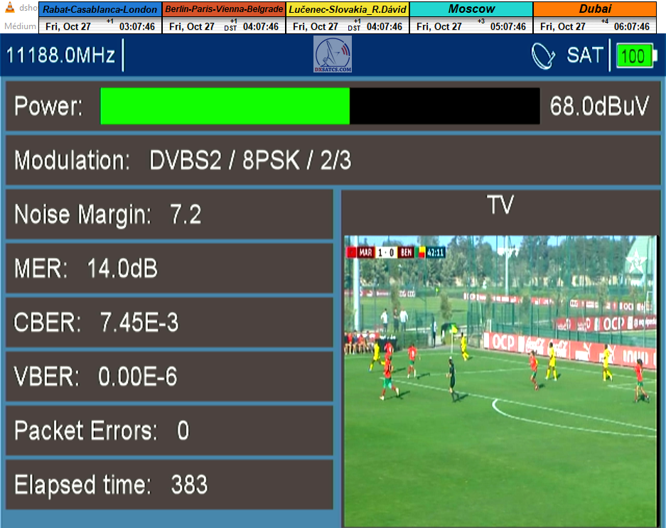 v štandarde DVB-S2/8PSK,dnes dokážem dosiahnutie exemplárneho stavu aj pri vysokom úhrne zrážok na frekvencii marockého provajdera SNRT Arryadia