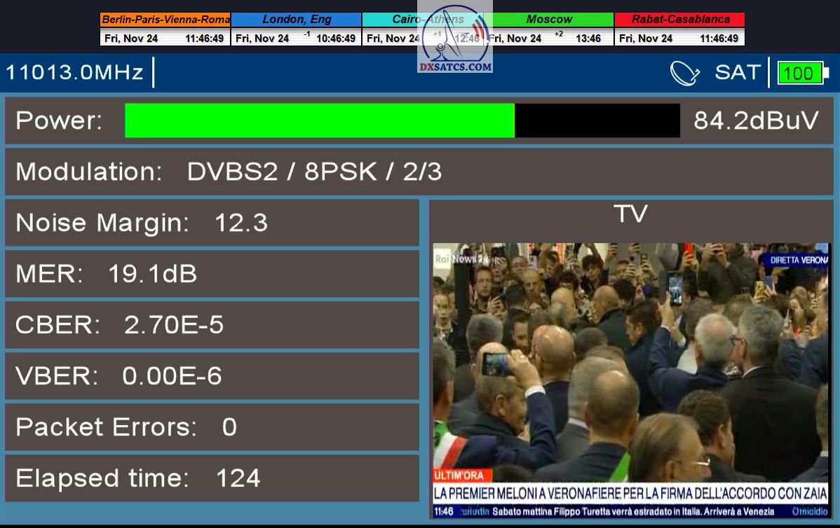 ►29.11.2023 : Based on the example of proving through signal monitoring of Rai and Canal+ packets broadcast in the DVB-S2/Multistream technological standard from the Eutelsat 5 West B satellite at 5.0°W, today I can demonstrate to you that I have effectively and, above all, stably transformed the relatively high intensity of the emitted EIRP power into the resulting quality which I quantify by the signal-to-noise ratio SNR=20>21+ dB_with the used configuration of modulation parameters of the signal path DVB-S2/8PSK/FEC=2/3.Today, I will demonstrate the effectiveness with which I have managed to minimize the mutual spectral penetration or interference of the waves from the V to the H quadrant and vice versa and how it relates to the resulting reception quality. I will perform a spectrum analysis with a frequency span of only 200 kHz, visualizing the presence of two frequencies with TT&C signals etc.