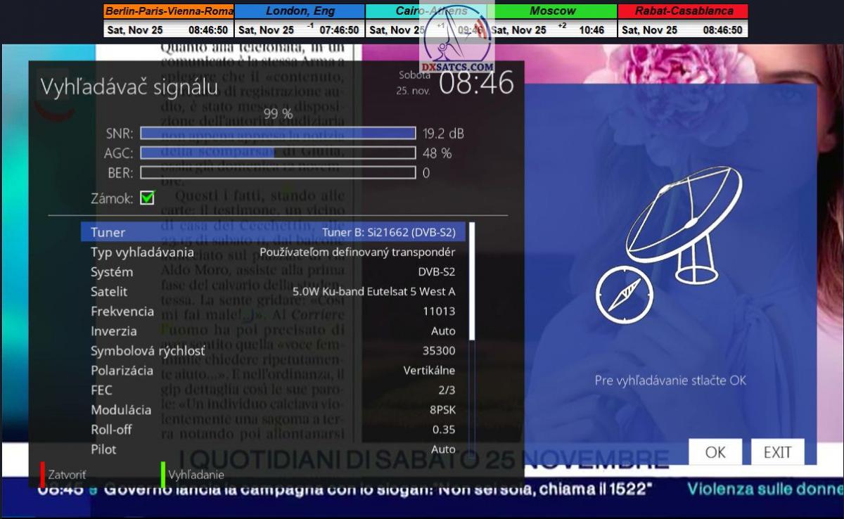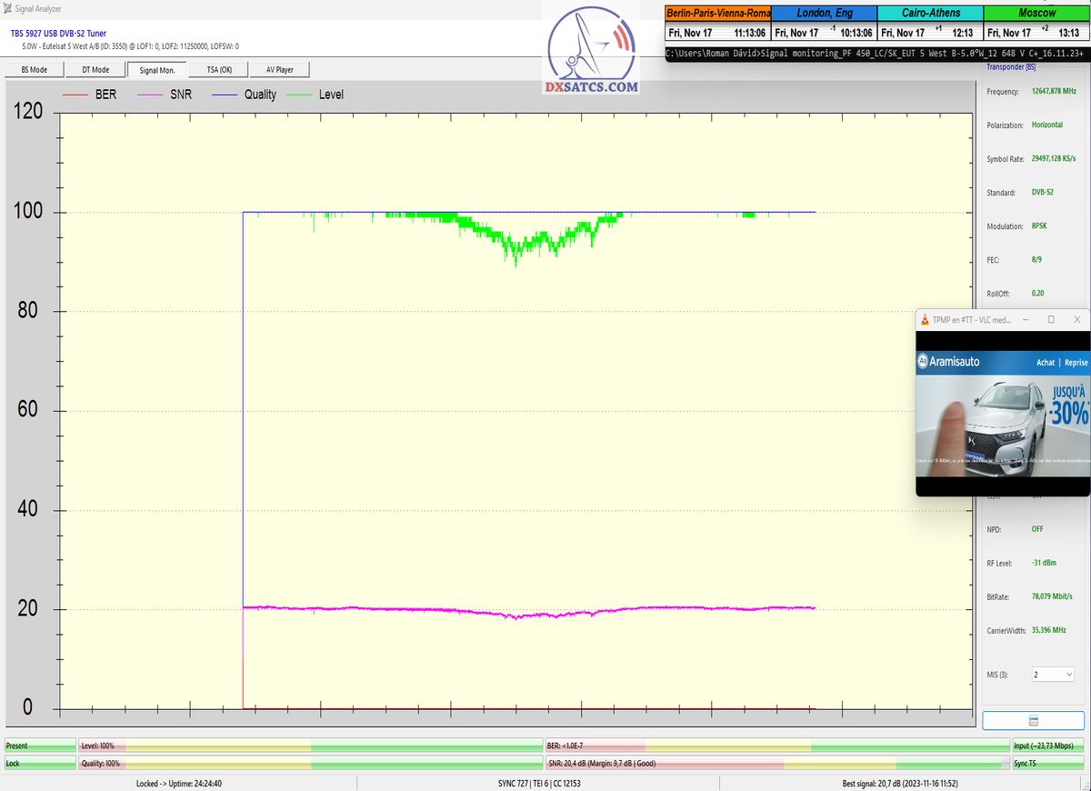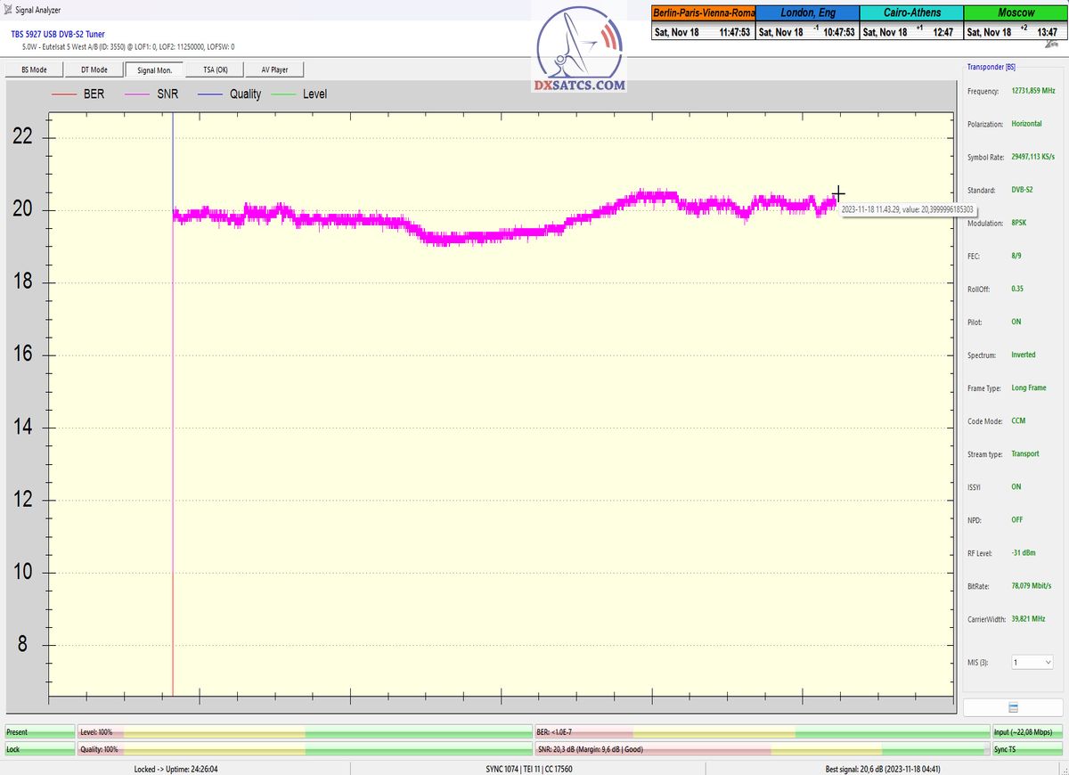 Na príklade dokazovania v podobe signálneho monitoringu paketov Rai a Canal+,vysielaných v technologickom štandarde DVB-S2/Multistream z objektu Eutelsat 5 West B na 5,0°W,Vám dnes dokážem že som účinne a hlavne stabilne transformoval relatívne vysokú intenzitu vyžiareného výkonu EIRP na výslednú kvalitu ,ktorú kvantifikujem pomerom signálu k šumu SNR=20>21+ dB-pri aplikovanej konfigurácii modulačných