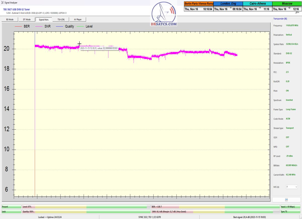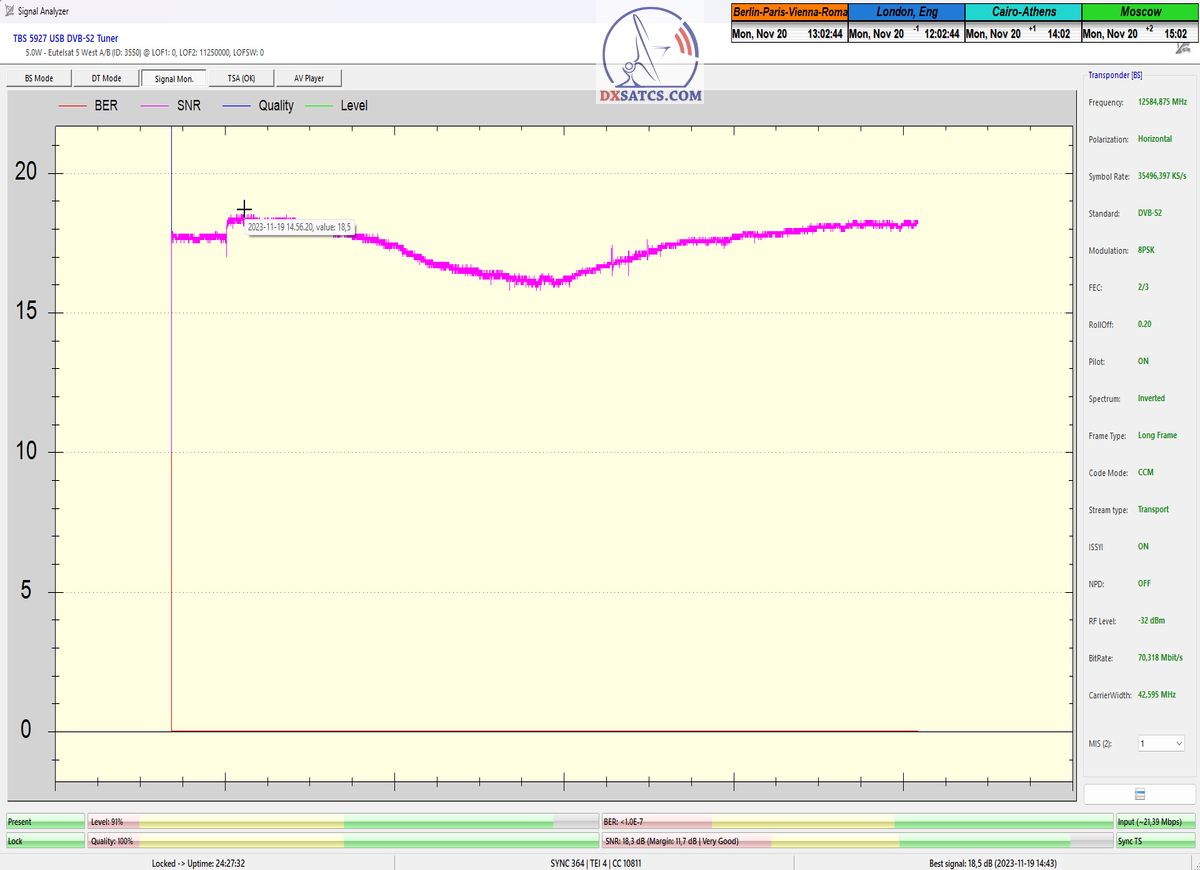 ►►Eutelsat 5 West B at 5.0°W-Transalpine-Multistream : Proving in the monitoring unit t=24 hours