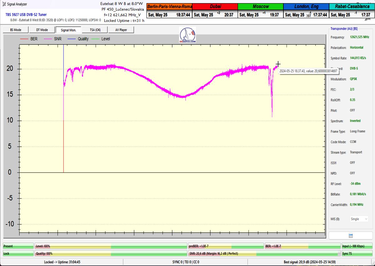 výrazne osciluje od približne 14 do 21 dB v jednotke odstupu Šignal/Šum_SNR a pri prechode prívalových búrok výrazne klesá až na 10,5 dB, pri dostatočne vysokej okamžitej rezerve okolo 5 dB.Typická výška signálnej rezervy pri štandardných a výrazne nezhoršených poveternostných podmienkach osciluje v rozsahu od 9 do 16,5 dB.Spracovanie rádiových nosných s vyššími úrovňami symbolových rýchlostí ako SR>200 ksym/s nepovažujem z technologického hľadiska za nič fyzikálne a ani softwérovo zložité a neštandardné z pohľadu dosiahnutia kontinuity LOCK-u a v podmienkach provajderom garantovane vysokých intenzín výkonu (EIRP=53 dBW) v európskom vyžarovcom diagrame družice Eutelsat 8 West B ich stabilitu príjmu nemusím a ani nebudem dokazovať a zvolil som len minimálnu verifikačnú jednotku t=60 minút,aby som sa vyhol prezentácii "bezcenných" sekundových Lockov z frekvenčného spektra.