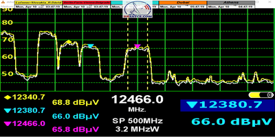►Špička kvality dosiahnutá v monitorovanom období od 2.4.2023 do 11.4.2023 : metodika postupu zberu dát o špičke kvality na f=12 466 MHz_V je v prípade analyzátora Metek HD a 4K receivera Octagon SF 4008 postavená na sústredení dát len v jeden konkrétny deň,konkrétne 10 a 11.4.2023, (z dôvodu aby som sa čo najviac priblížil dňu uverejnenia),nie na každodennom monitoringu a zbere dát o špičke kvality za jednotku t=9 dní, pretože potom s pravdepodobnosťou,ktorá hraničí s istotou by bola dosiahnutá špička kvality ešte vyššia.