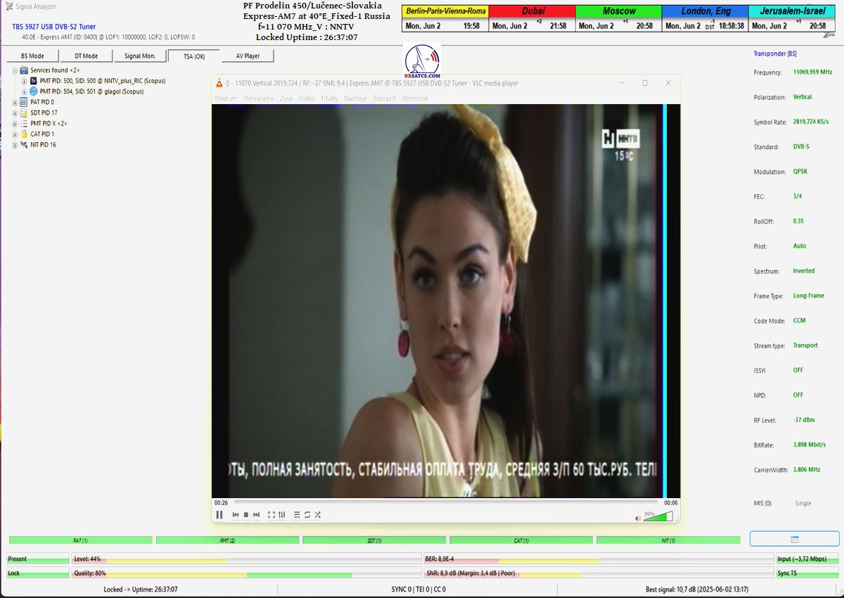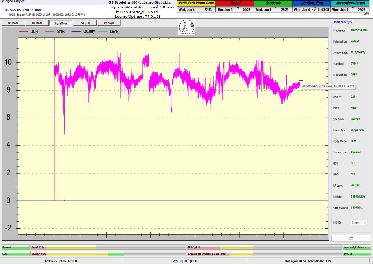 SK_Výsledky signálneho monitoringu nespochybnitelne dokazujú že som v jednotke monitoringu t=77 hodín,nosnej frekvencie NNTV na f=11 070 MHz_V, dokázatelne dosiahol stabilný príjem na 100% bez výskytu čo i len jedného výpadku v spojitosti priebehu funkcie Locku alebo pixelácie. Zaznamenal som špičku kvality SNR=10,7 dB a jediný výskyt poklesu modrého priebehu kvality Q na hladinu Q=40% sa odohral presne 1x a to po príchode búrkovej oblačnosti a výskyte dažďových prehánok dňa 1.6.2025 presne o 20:35 SEČ,čo nespochybniteľne dokazujú výsledky meraní úhrnu zrážok zo zdroja shmu.sk.