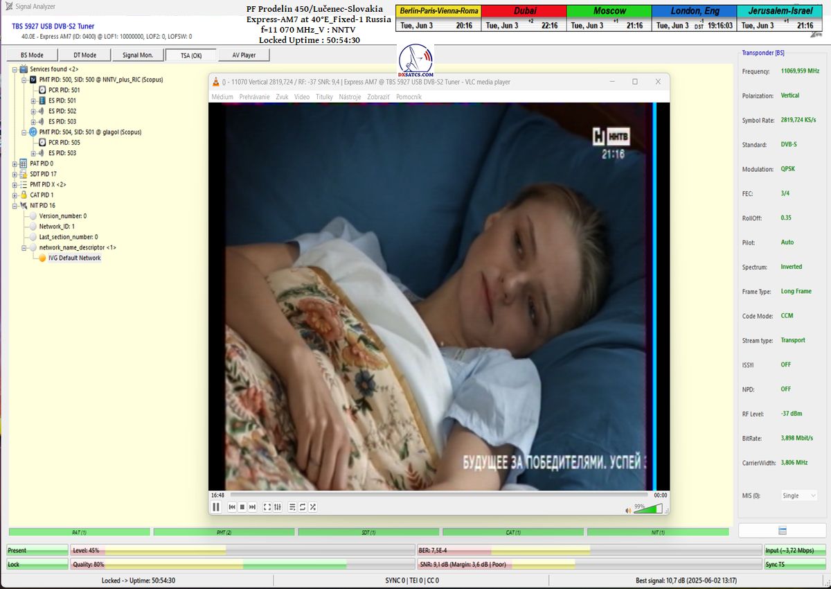 ENG_The results of signal monitoring unequivocally confirm that during the verification interval of t = 77 hours, for the NNTV carrier frequency at f = 11,070 MHz_V, I demonstrably achieved 100% stable reception without a single occurrence of signal loss related to Lock status or pixelation.A peak SNR quality of 10.7 dB was recorded, and the only instance of a drop in the blue Q-quality curve to the level of Q = 40% occurred exactly once — following the arrival of storm cloud cover and the onset of rain showers on June 1, 2025 at precisely 20:35 CET, as irrefutably verified by precipitation data from the source shmu.sk.