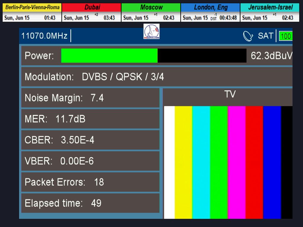 ►Modulácia: QPSK (DVB-S) ►Špička kvality SNR:10,7 dB (celková špička SNR=11,3 dB)