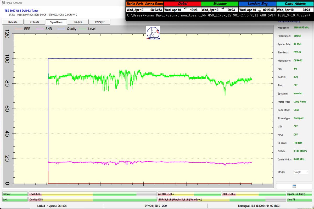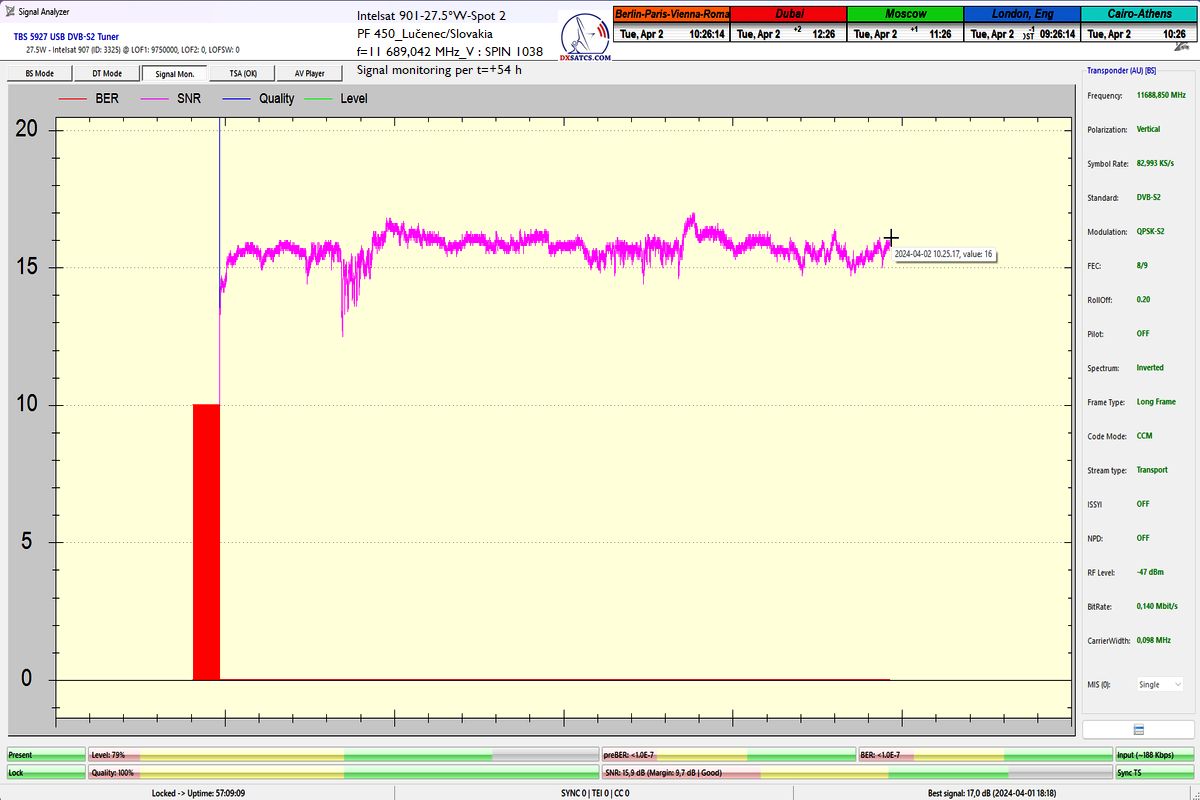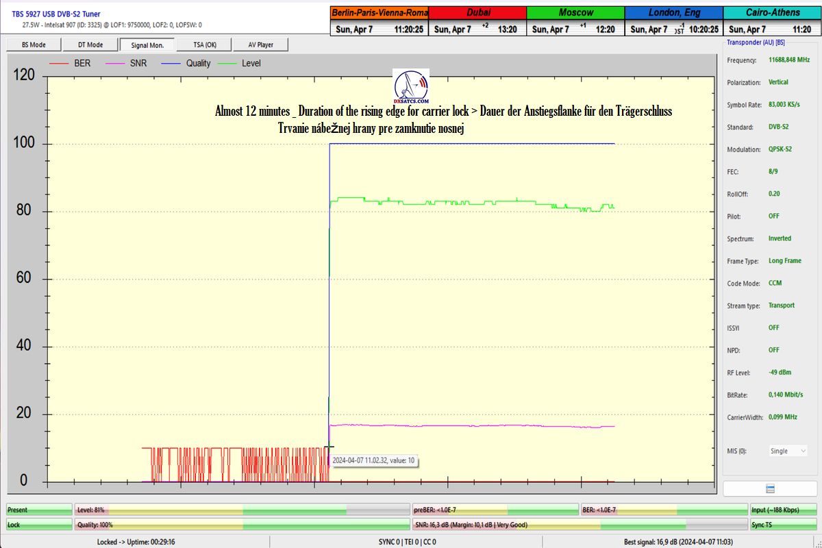 ►Auf Deutsch_Klassifikation der erreichten Ergebnisse bei f=11 689,042 MHz: Das Signalmonitoring in der Einheit t=77 Stunden beweist zweifelsfrei,dass ich ein konstantes LOCK-Verhalten mit einem Spitzen-SNR-Qualität von 17 dB erreicht habe,ohne Unterbrechung in der Kontinuität der Q-Qualität,mit anderen Worten,einen nachweisbaren Empfangsstabilität des Radiosenders SPIN 1038 mit SR=83 ksym/s zu 100%.