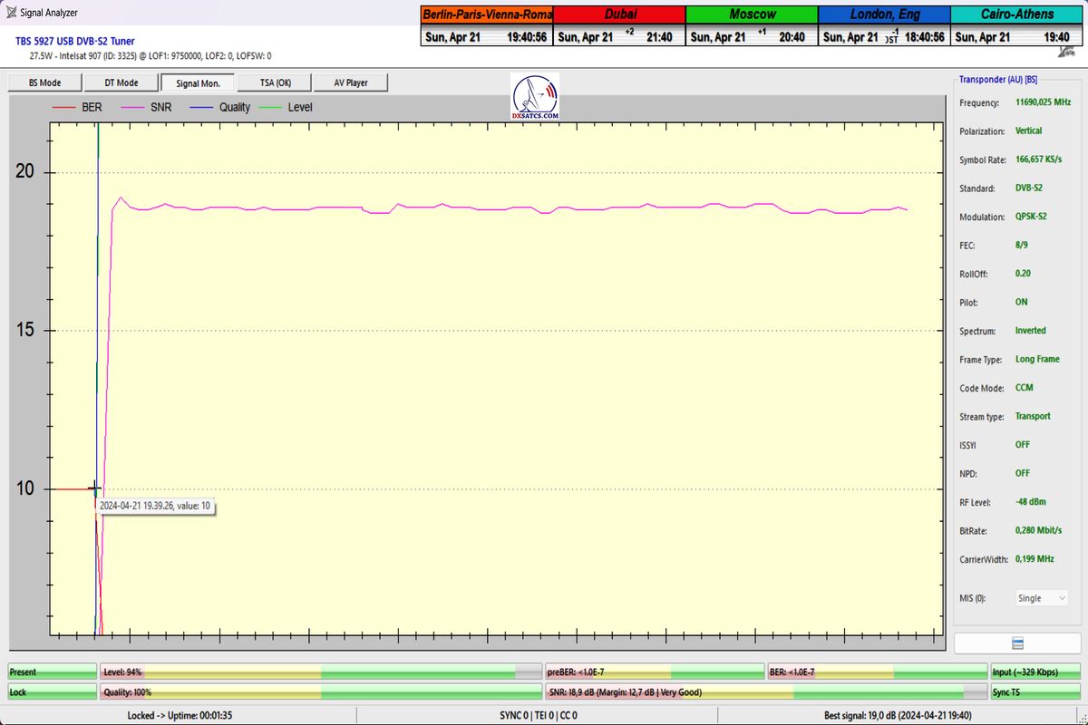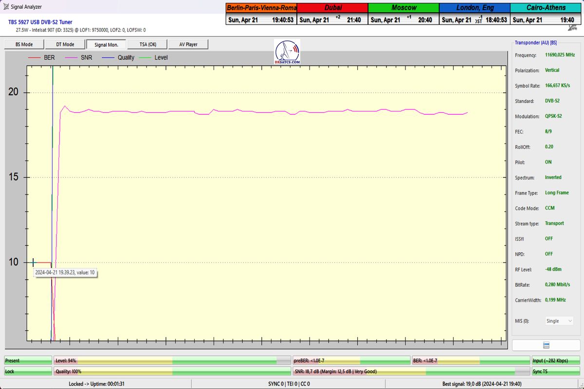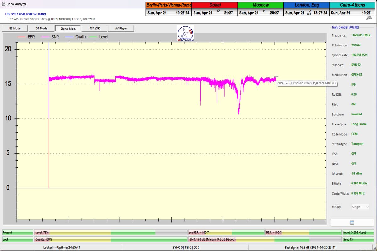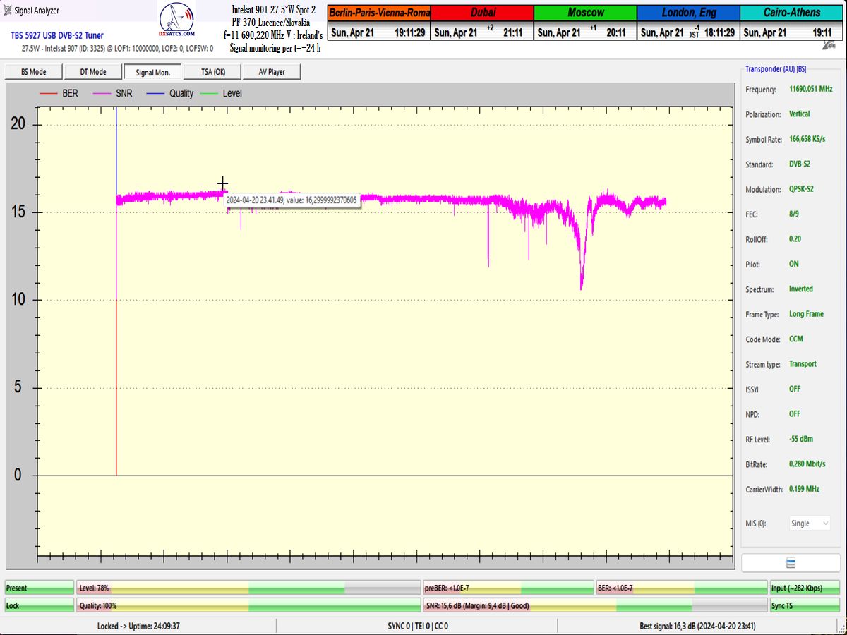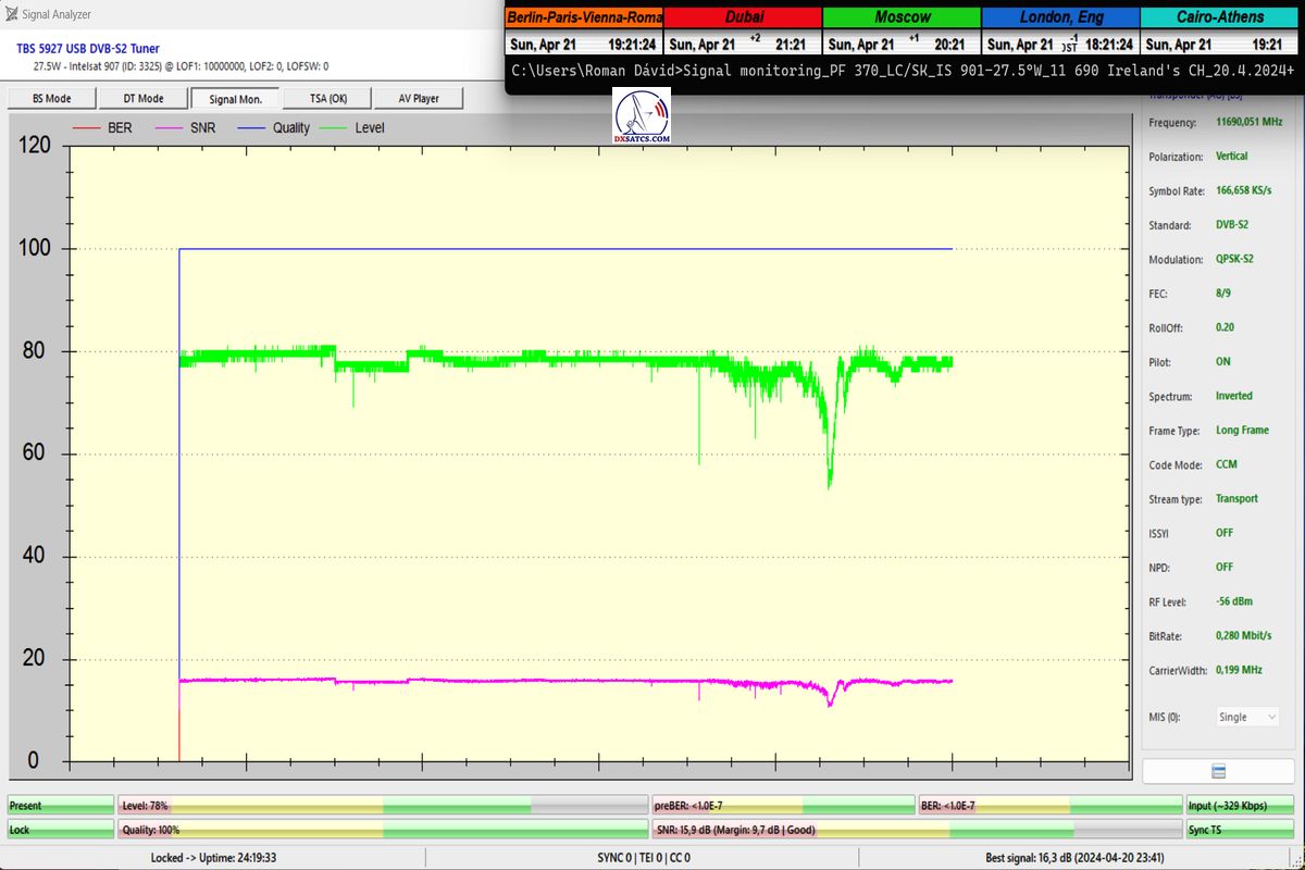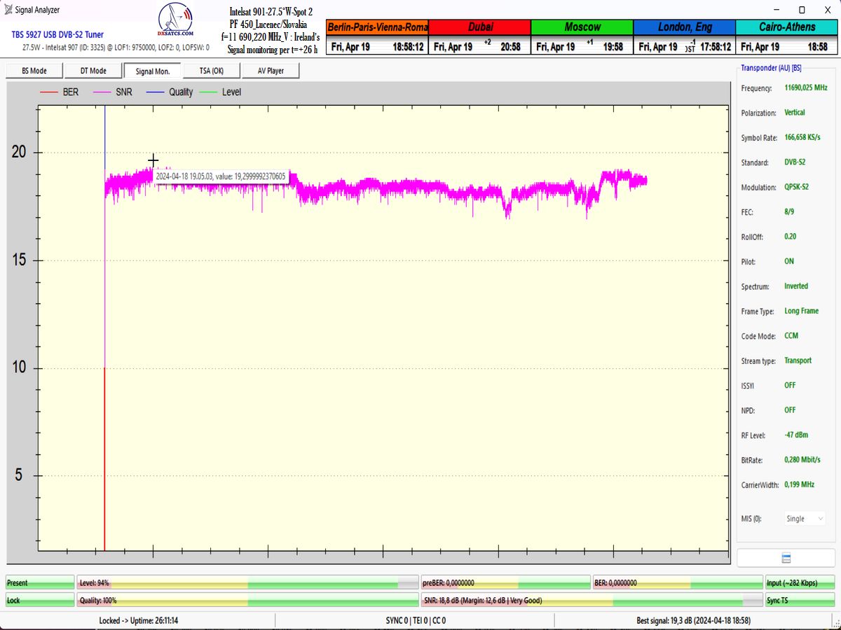 SNR=19,1 dB, durchgeführt vom 26. bis 27. März 2024 ►Prvý skúšobný monitoring a vizualizované dokazovanie s nasledovným výsledkom : stabilný príjem na 100% v jednotke t=24+ hodín so špičkou kvality SNR=19,1 dB,