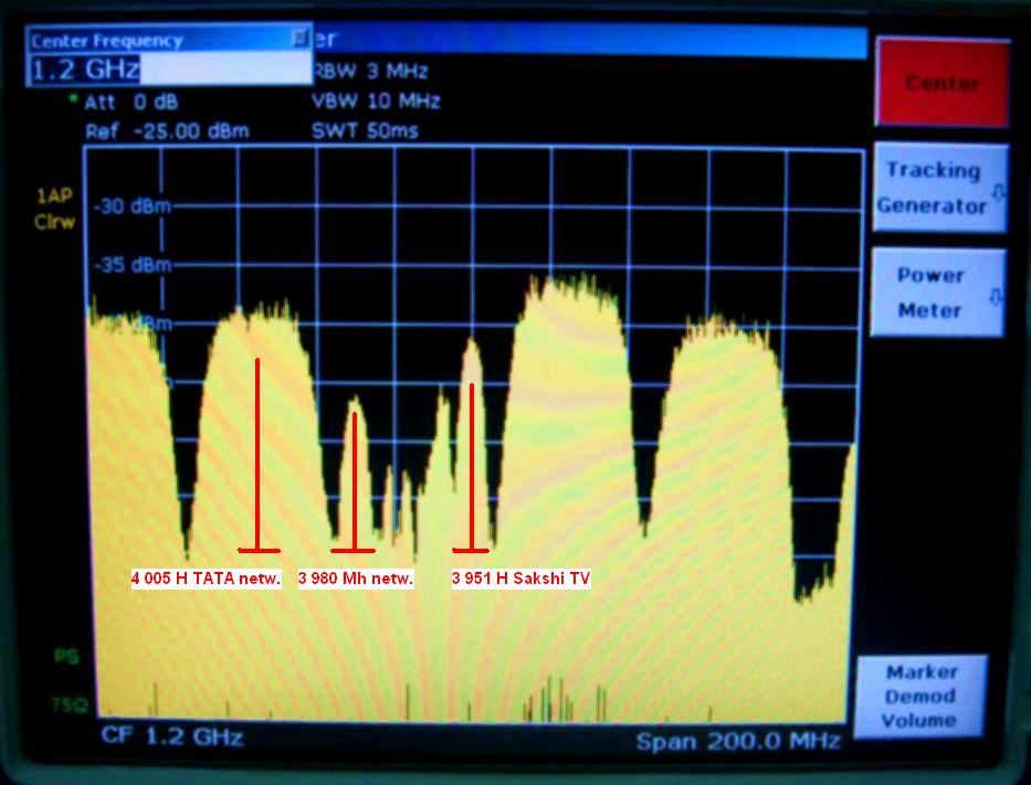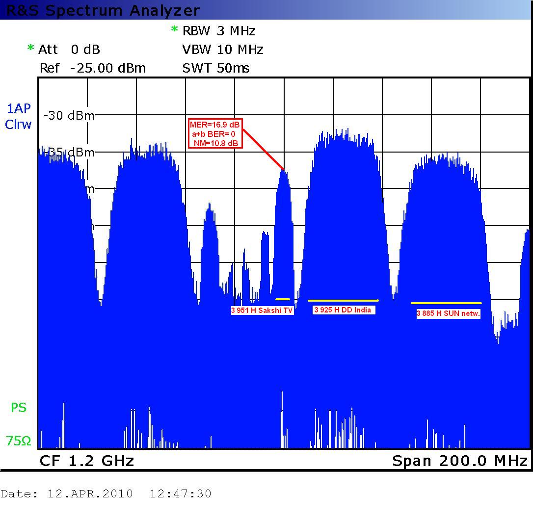 Insat 4B at 93.5°E - 3 950 H MPEG-4 Sakshi TV :spectral analysis with Rohde & Schwarz ETL 500 kHz-3 GHz