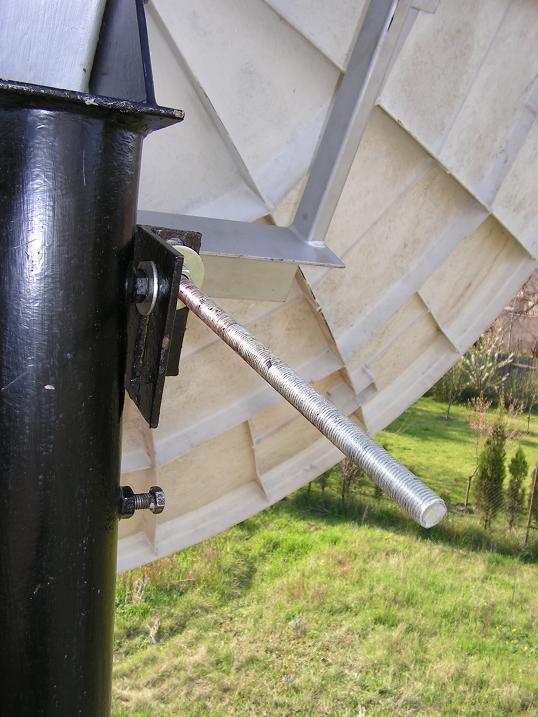 Jedná sa o stredové prevedenie anténneho tvaru v zapojení RX,ktorý je tvorený zo 4 segmentov.Vysoká tvarová stálosť a pevnosť celej reflektorovej plochy,čo prioritne súvisí ako som to vyššie popisoval s najdôležitejším parametrom ,ktorým je dosiahnutý zisk pri vysokej smerovosti, je odvodená od použitého materiálu,ktorým je FIBERGLASS-sklenené vlákno-sklolaminát , ktorý pri vysokej tvarovej stálosti odoláva veľkým tepelným zmenám a tým pádom garantuje stálosť signálnej kvality,vďaka pevnému rebrovaniu z opačnej strany reflektora.Podsatným faktorom pri tomto priemere 300 cm je aj samotná hmotnosť jednotlivých segmentov ,ktorá nepresahuje 25 kg,čo mi podstatným spôsobom uľahčovalo montáž celého reflektora,ktorý dve osoby zvládnu za necelých 60 minút.Podpornú štruktúru nosníka LNB tvoria 4 ks duralových trubiek s dostatočným priemerom ,ktorý dokáže stabilizovať aj kombinované riešenia na spracovanie C/KU pásma s hmotnosť viac ako 5 kg.Originálnou súčasťou celého anténneho kompletu je aj ochranný kryt LNB proti poveternostným vplyvom s medzikruhom pre C pásmový skalárny prstanec,ktorý ako to vidno na obrázku vytvára dokonalý jednoliaty celok,ktorý sa v súčastnej komerčnej praxi vyskytuje len zriedka.Celá poloha ochranného krytu je navyše fixovaná 4.skrutkami.K anténe výrobca dodával originálny polárny záves PLM,ktorý je mimoriadne pevný a jediným zásahom ,ktorý som musel vykonať je prerobenie dĺžky závitovej tyče polárneho uhla resp.elevačného uhla, nakoľko jeho pôvodná poloha neumožňovala zadefinovať NULOVÝ BOD v mieste príjmu,čím je družica Astra 19,2°E.Na zmeny azimutu som nainštaloval bežný tiahlový motor v dĺžke výsuvnej tyče 36 palcov-91 cm,ktorý aj v najkrajnejších azimutálnych polohách v ktorých naň pôsobí najväčší odpor dokázal bez problémou definovať polohu celej zostavy s hmotnosťou okolo 150 kg.Celé fixovanie anténnej zostavy na nosnej rúre s priemerom 114 mm a s dĺžkou 500 cm nad zemským povrchom,je účinne stabilizované rúrou s vnútorným priemerom 130 mm a s dĺžkou 100 cm na ktorej sa nachádza 10 stabilizačných skrutiek M12.Celý T kĺb je fixovaný mohutným šróbom M22. Zložený reflektor antény je fixovaný k polárnemu závesu pomocou štyroch profilov tvaru L z pásoviny s hrúbkou 8 mm.Po zložení celého systému polárneho závesu celok vykazoval vysokú konštrukčnú pevnosť čo mi umožňovalo prejsť k tomu najdôležitejšiemu - zadefinovaniu ohnniskovej vzdialenosti "f" načom stojí celý zisk antény v kombinácii so správnym nastavením PLM.