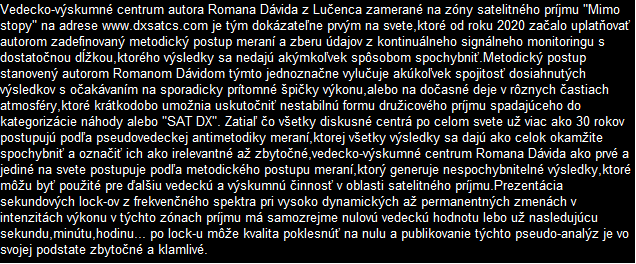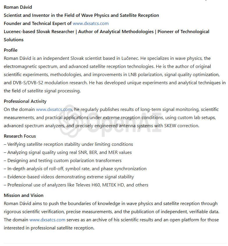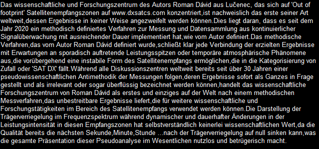 Das wissenschaftliche und Forschungszentrum des Autors Roman Dávid aus Lučenec, das sich auf 'Out of footprint' Satellitenempfangszonen auf www.dxsatcs.com konzentriert,ist nachweislich das erste seiner Art weltweit,dessen Ergebnisse in keiner Weise angezweifelt werden können. Dies liegt daran, dass es seit dem Jahr 2020 ein methodisch definiertes Verfahren zur Messung und Datensammlung aus kontinuierlicher Signalüberwachung mit ausreichender Dauer implementiert hat,wie vom Autor definiert.Das methodische Verfahren,das vom Autor Roman Dávid definiert wurde,schließt klar jede Verbindung der erzielten Ergebnisse mit Erwartungen an sporadisch auftretende Leistungsspitzen oder temporäre atmosphärische Phänomene aus,die vorübergehend eine instabile Form des Satellitenempfangs ermöglichen,die in die Kategorisierung von Zufall oder 'SAT DX' fällt.Während alle Diskussionszentren weltweit bereits seit über 30 Jahren einer pseudowissenschaftlichen Antimethodik der Messungenfolgen,deren Ergebnisse sofort als Ganzes in Frage gestellt und als irrelevant oder sogar überflüssig bezeichnet werden können,handelt das wissenschaftliche Forschungszentrum von Roman Dávid als erstes und einziges auf der Welt nach einem methodischen Messverfahren, das unbestreitbare Ergebnisse liefert,die für weitere wissenschaftliche und Forschungstätigkeiten im Bereich des Satellitenempfangs verwendet werden können.Die Darstellung der Trägerverriegelung im Frequenzspektrum während dynamischer und dauerhafter Änderungen in der Leistungsintensität in diesen Empfangszonen hat selbstverständlich keinerlei wissenschaftlichen Wert,da die Qualität bereits die nächsten Sekunde,Minute,Stunde ... nach der Trägerverriegelung auf null sinken kann,was die gesamte Präsentation dieser Pseudoanalyse im Wesentlichen nutzlos und betrügerisch macht.