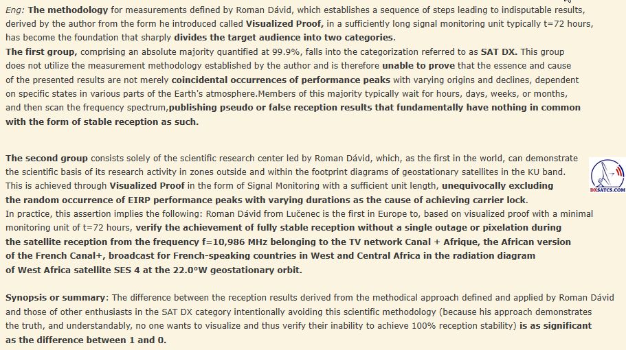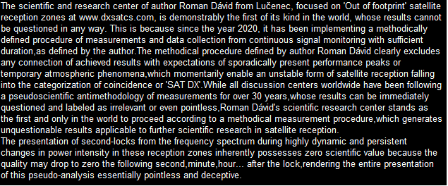 The scientific and research center of author Roman Dávid from Lučenec, focused on 'Out of footprint' satellite reception zones at www.dxsatcs.com is demonstrably the first of its kind in the world, whose results cannot be questioned in any way. This is because since the year 2020,it has been implementing a methodically defined procedure of measurements and data collection from continuous signal monitoring with sufficient duration,as defined by the author.The methodical procedure defined by author Roman Dávid clearly excludes any connection of achieved results with expectations of sporadically present performance peaks or temporary atmospheric phenomena,which momentarily enable an unstable form of satellite reception falling into the categorization of coincidence or 'SAT DX'.While all discussion centers worldwide have been following a pseudoscientific antimethodology of measurements for over 30 years,whose results can be immediately questioned and labeled as irrelevant or even pointless, Roman Dávid's scientific research center stands as the first and only in the world to proceed according to a methodical measurement procedure, which generates unquestionable results applicable to further scientific research in satellite reception.The presentation of second-locks from the frequency spectrum during highly dynamic and persistent changes in power intensity in these reception zones inherently possesses zero scientific value because the quality may drop to zero the following second,minute,hour... after the lock,rendering the entire presentation of this pseudo-analysis essentially pointless and deceptive.