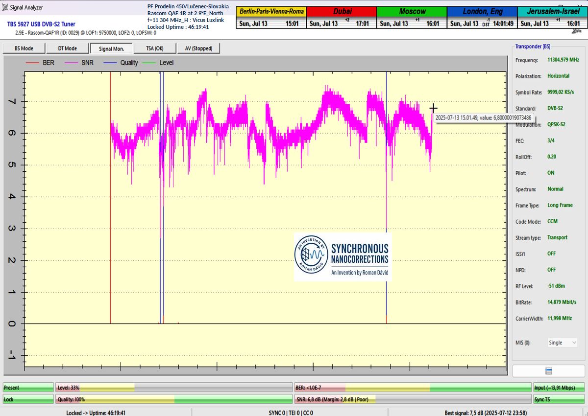 ENG_As verified by the visualized method of evidence in the signal monitoring unit with a duration of t = 79 hours (which equals exactly 284,400 seconds),the total length of Lock losses or oscillations near the noise threshold amounted to only fifteen seconds out of the entire 284,400-second interval. This corresponds to a signal stability of exactly 99.99%.The sole guarantor of the achieved signal stability from f = 11,304 MHz_H, as demonstrated below, is the technological invention entitled Synchronous Nanocorrections, developed by the scientist and inventor Roman Dávid from Lučenec. As further proven, this invention enables sudden increases in signal quality, immediately raising the signal margin by +0.5 to +2.5 dB