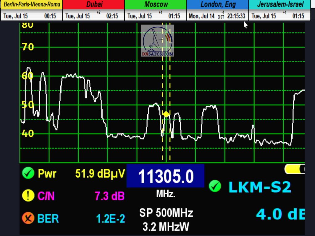>DE_Verifizierung der technologischen Erfindung „Synchron-Nanokorrekturen“ durch den Wissenschaftler und Erfinder Roman Dávid aus Lučenec beim Satellitenempfang aus dem Footprint von NORTH Africa in Mitteleuropa, wo sie sich als einziger Garant für die Erreichung einer Empfangsstabilität von 99,99 % unter dynamisch variablen Signalbedingungen mit häufigen und unregelmäßigen Leistungseinbrüchen (EIRP) erwiesen hat.