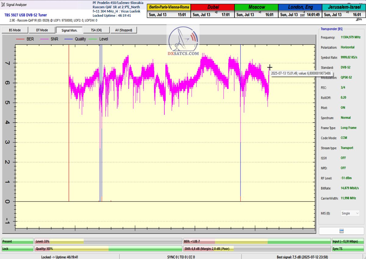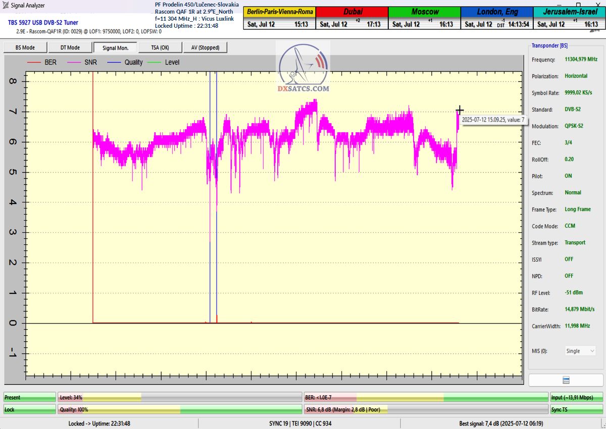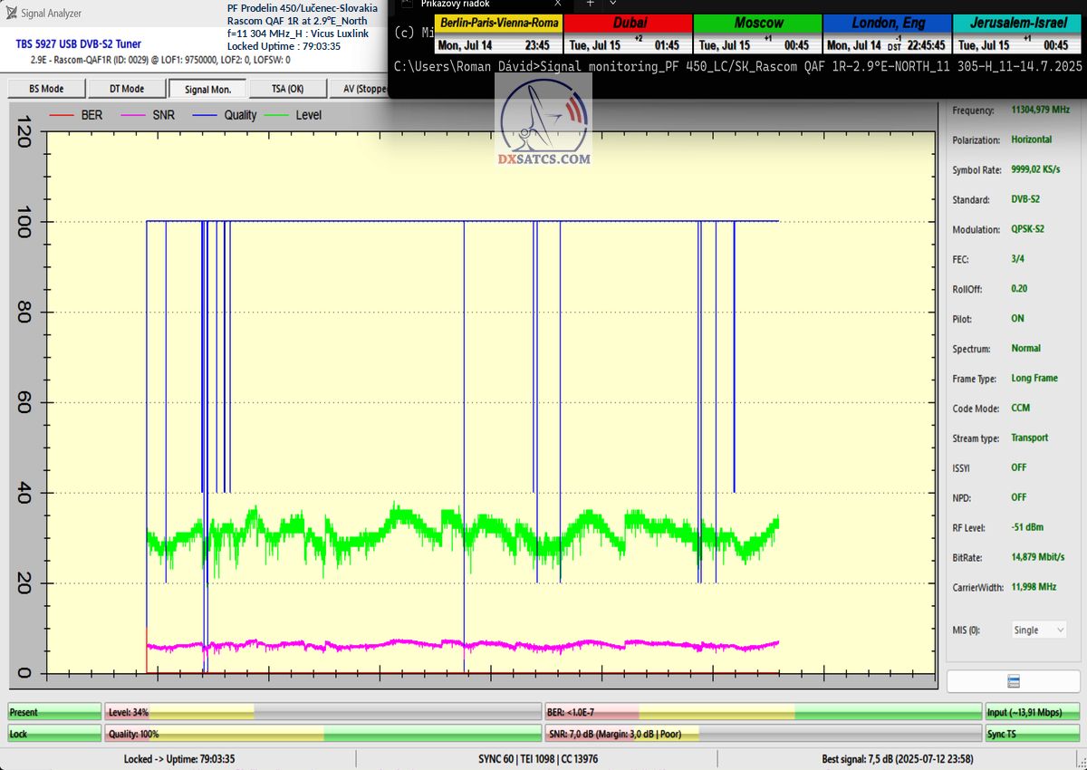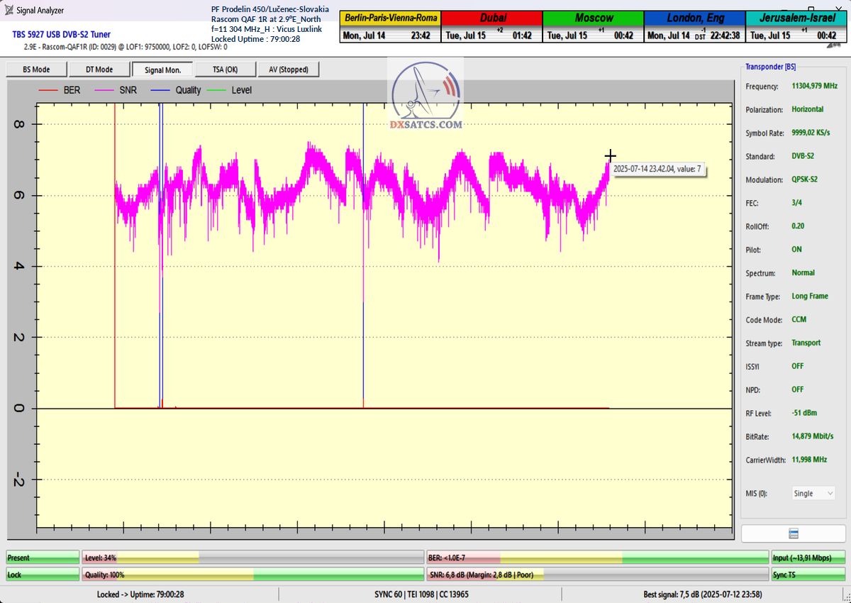 ►EN_Classification of achieved results at f=11 305 MHz : As confirmed by the visualized form of verification in the signal monitoring over a duration of t = 79 hours (which corresponds exactly to 284,400 seconds),Lock losses or quality oscillations near the noise threshold occurred for a total of only fifteen seconds out of the full 284,400 seconds.This corresponds to a reception stability rate of exactly 99.99%.