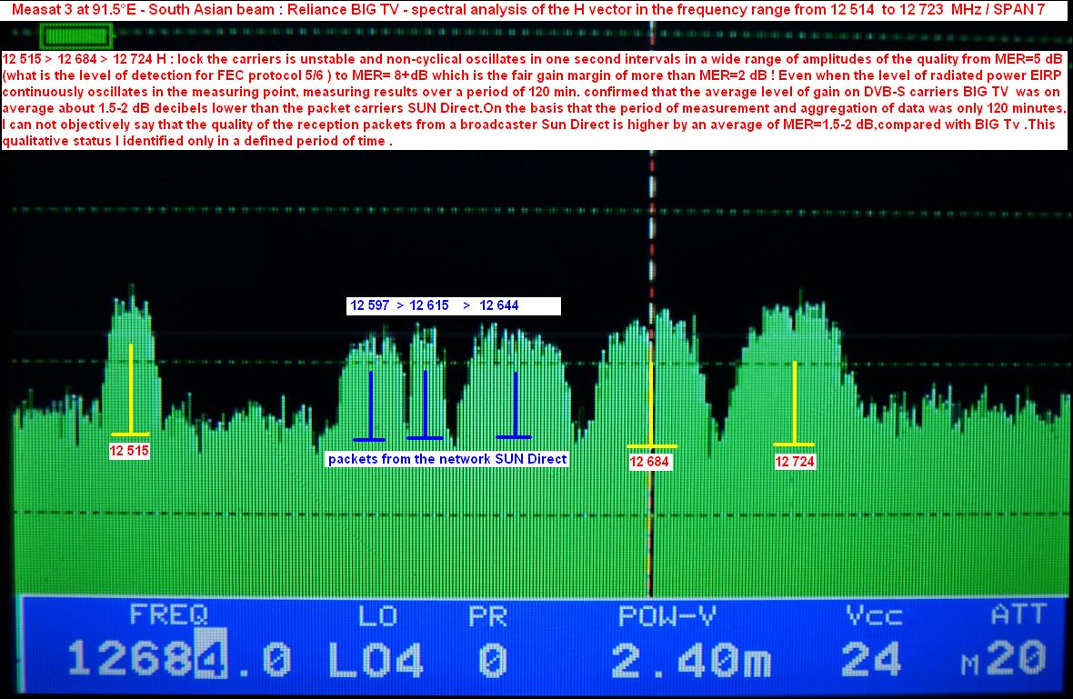 RELIANCE BIG TV on Measat 3 at 91.5°E in South Asian footprint & current status of the quality of reception and changes in the packet Big Tv in Central Europe : 12 515-12 684-12 724 MHz spectral analysis of the H wave vector and measured reception quality