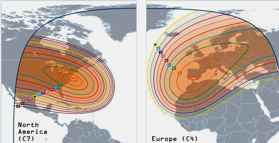 area. It carries a global beam, a fixed spot beam over the Eastern U.S., and three spot beams that can be